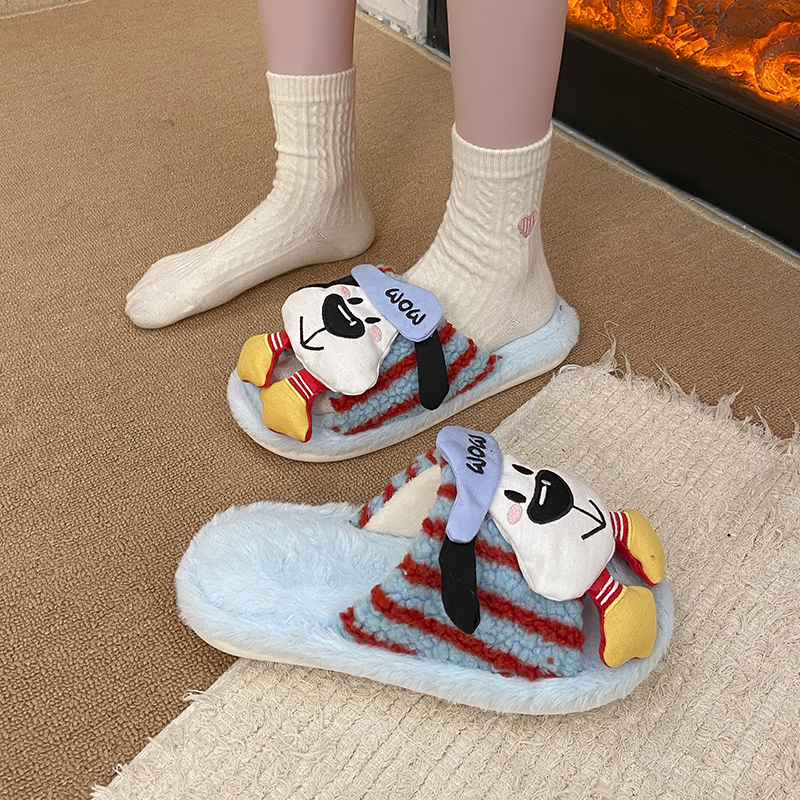 轻便舒适居家拖鞋 保暖软底棉拖鞋 少女冬季 卡通修勾条纹毛毛拖鞋