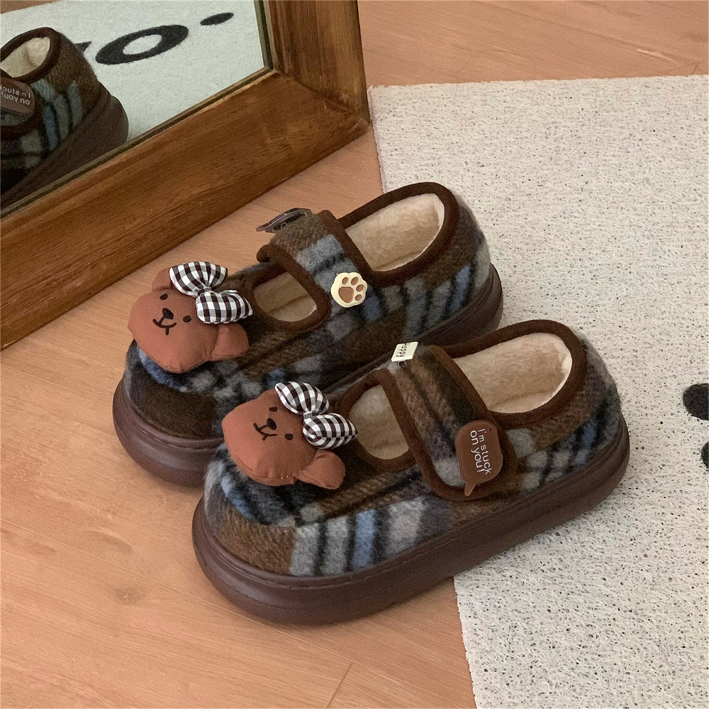 冬 防滑厚底女士魔术贴豆豆鞋 细细条 可爱小熊休闲学生玛丽珍棉鞋