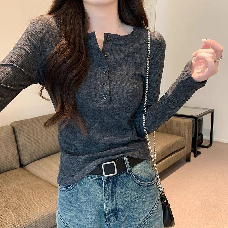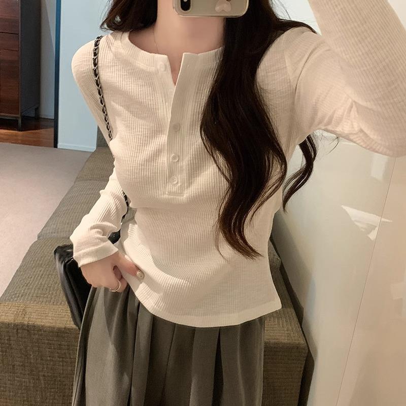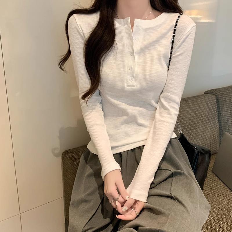 显瘦1009u 简约百搭修身 秋冬黑色半开领正肩长袖 T恤女士2025秋新款