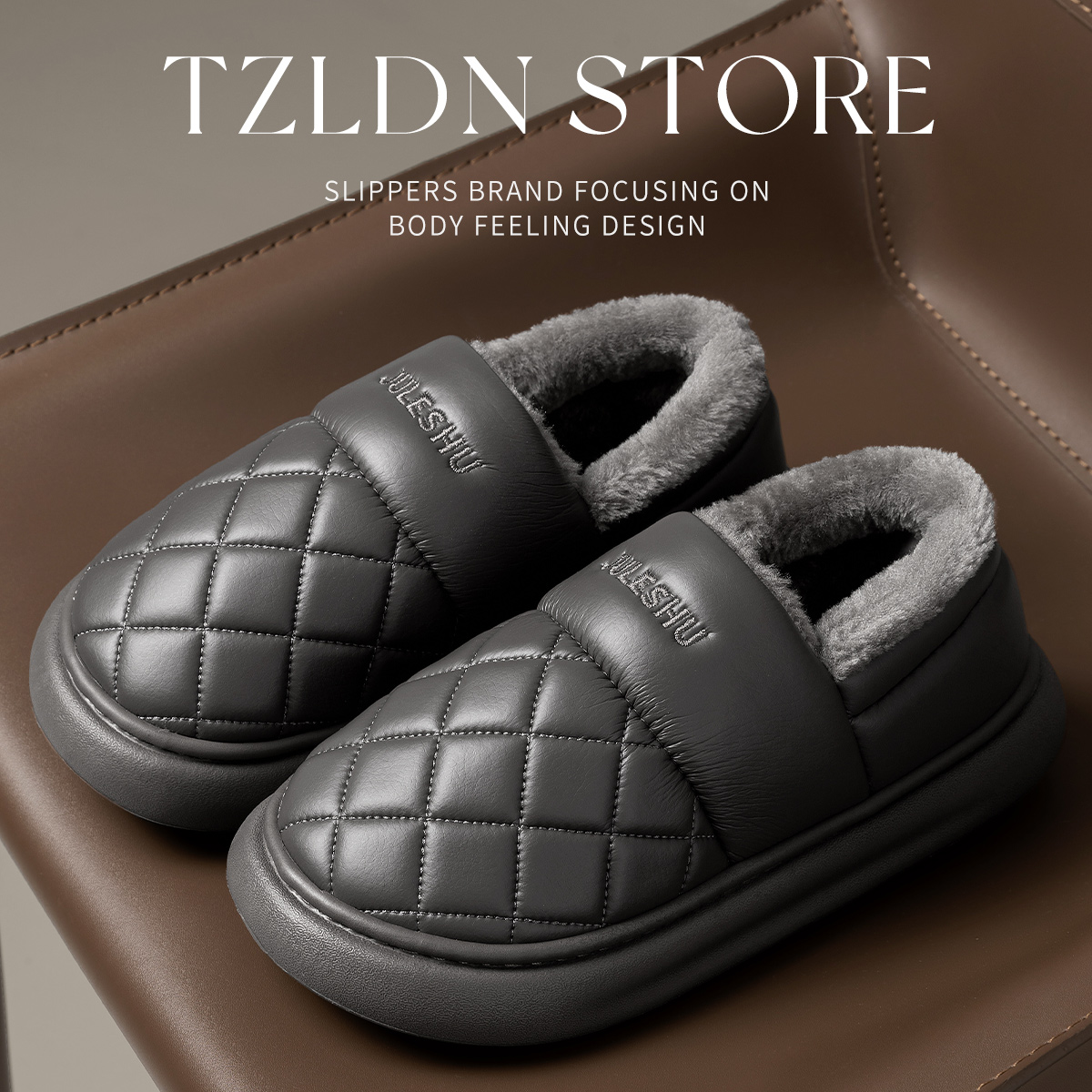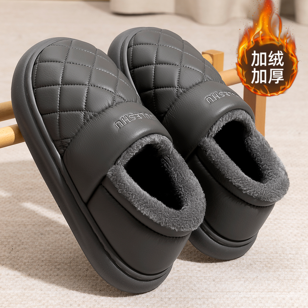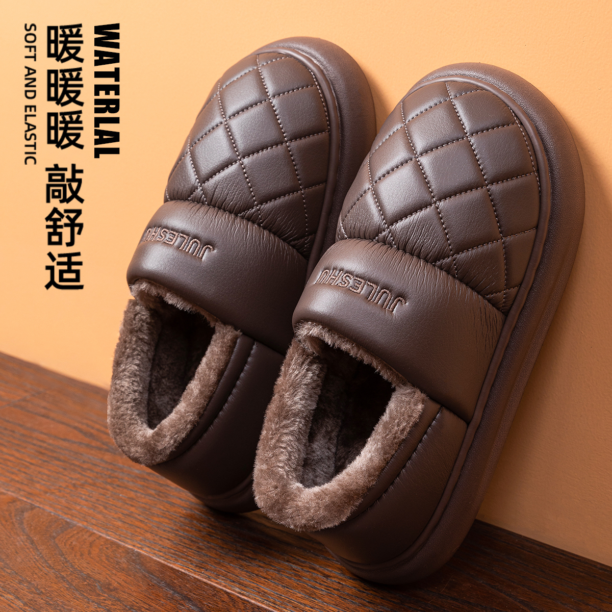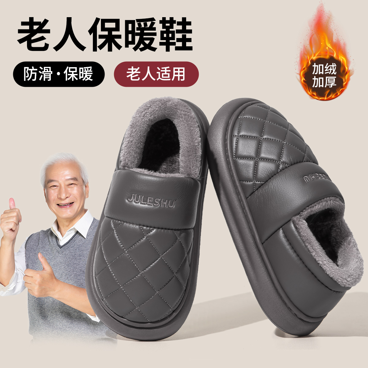 家居室内加厚保暖防滑老人pu棉拖男士 冬季 外穿 男款 皮面防水棉拖鞋