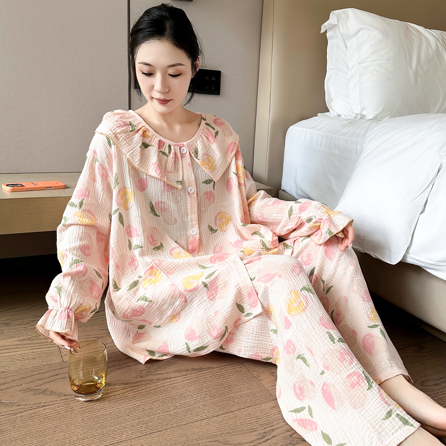 甜美风纯棉宽松家居服200斤 长裤 双层棉纱大码 睡衣女春秋胖mm长袖