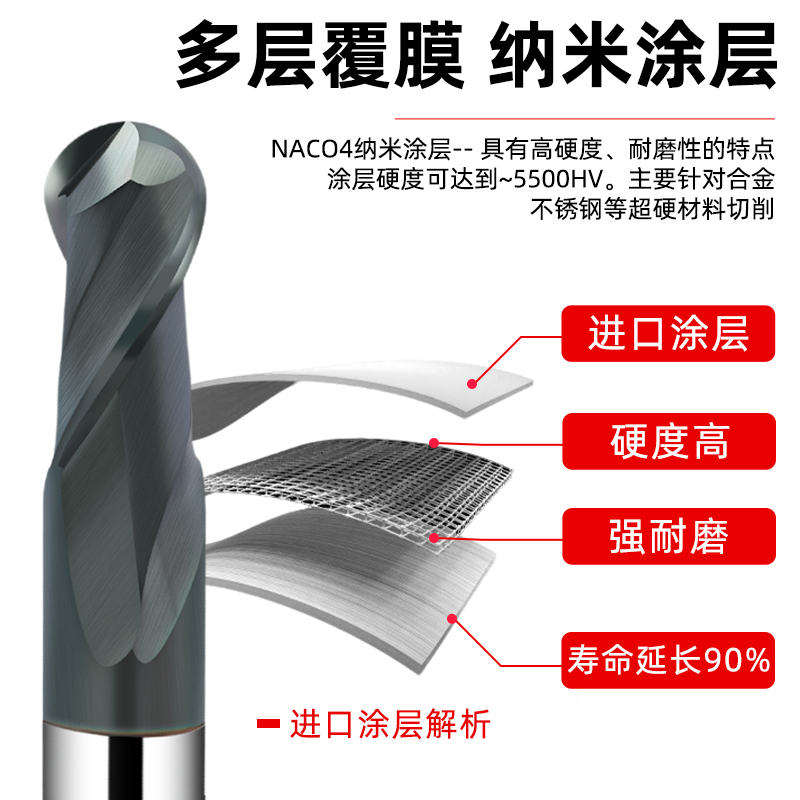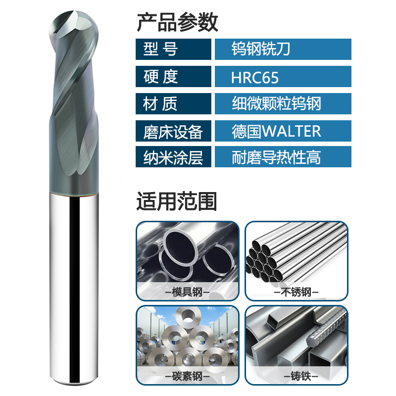 65度钨钢球头铣刀高硬加长2刃合金涂层球形刀cnc加工钢用R1R6球刀