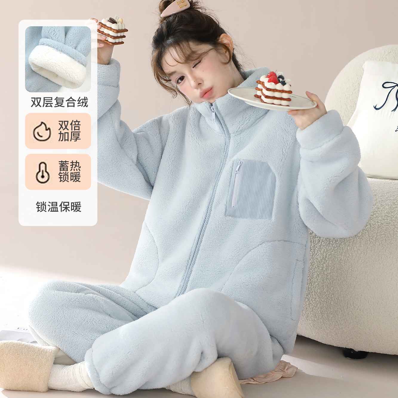 加绒加厚双层复合雪花绒秋冬可外穿暖绒保暖女士法兰绒家居服睡衣