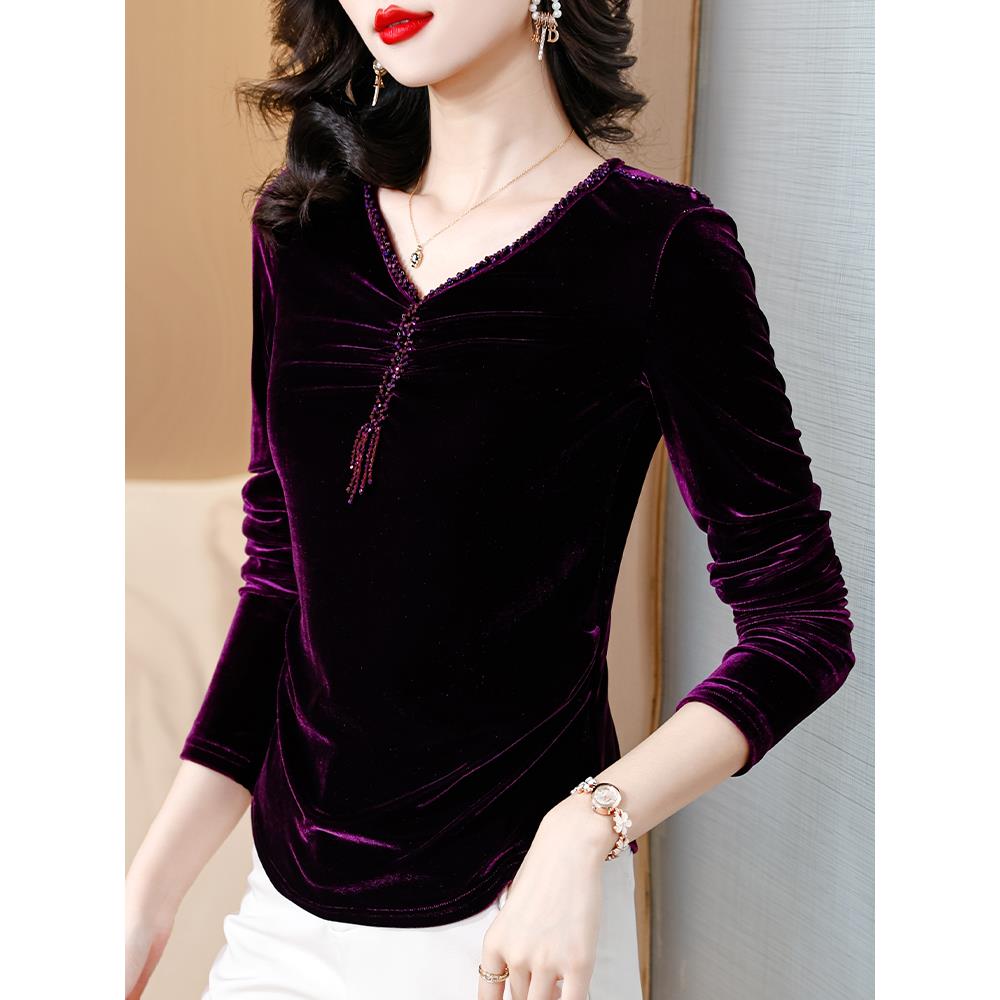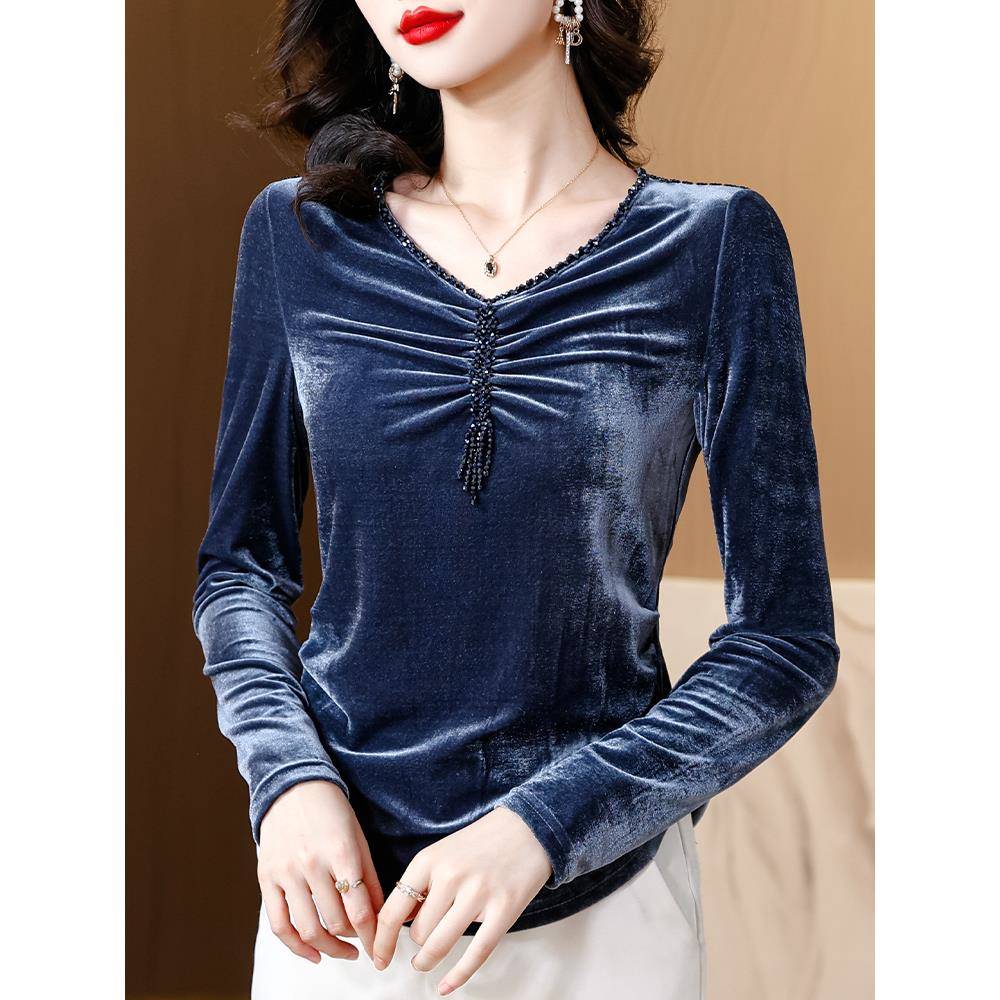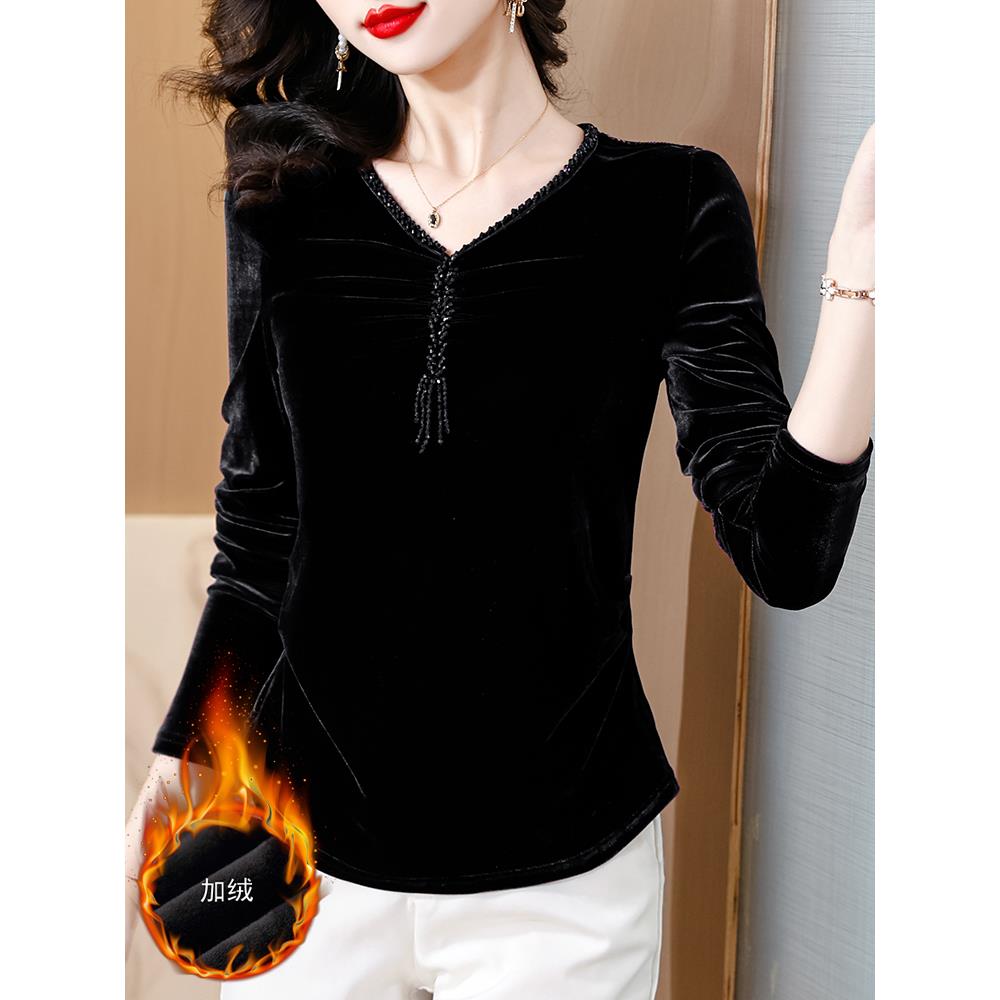 T恤高端洋1010z V领钉珠长袖 秋冬黑色金丝绒打底衫 女内搭2025新款