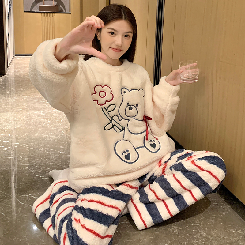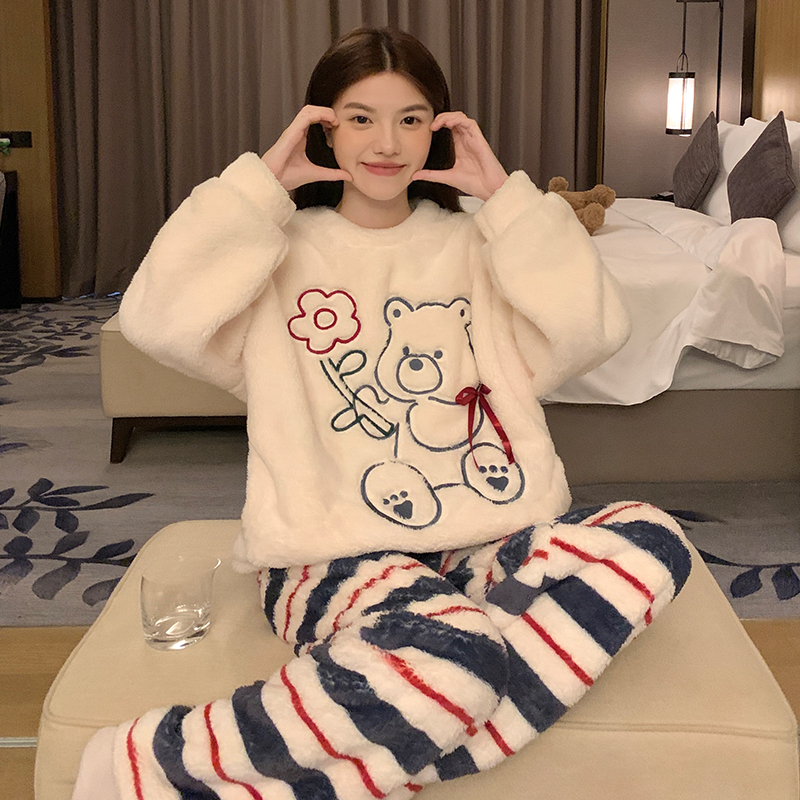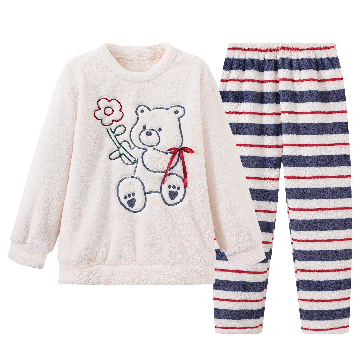 套装 睡衣女冬季 雪尼尔半边绒睡衣条纹卡通家居服D 定金预售 yso