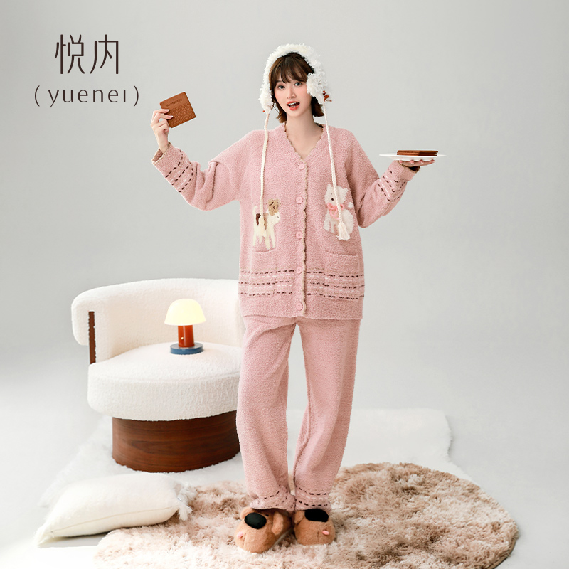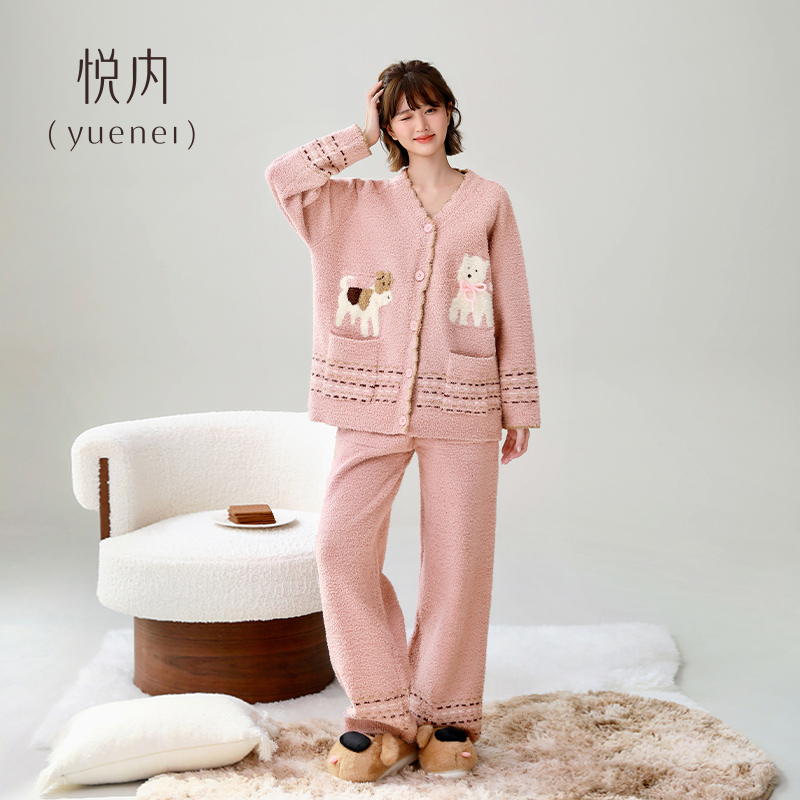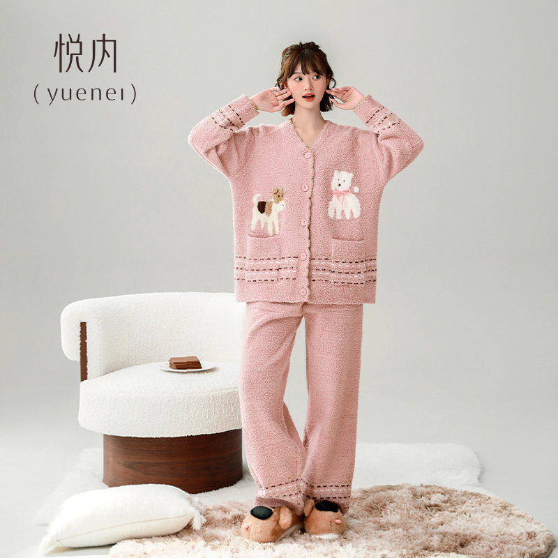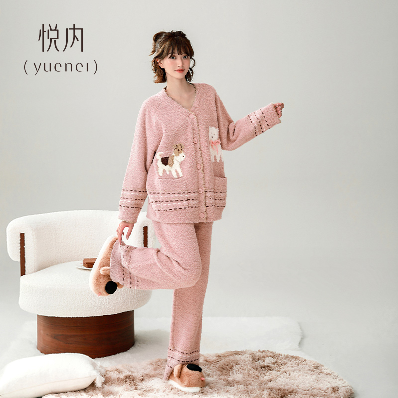 悦内半边绒睡衣女冬季 珊瑚绒家居服保暖软绵绵粉色可爱小狗 秋冬款