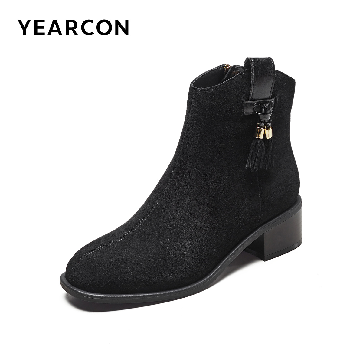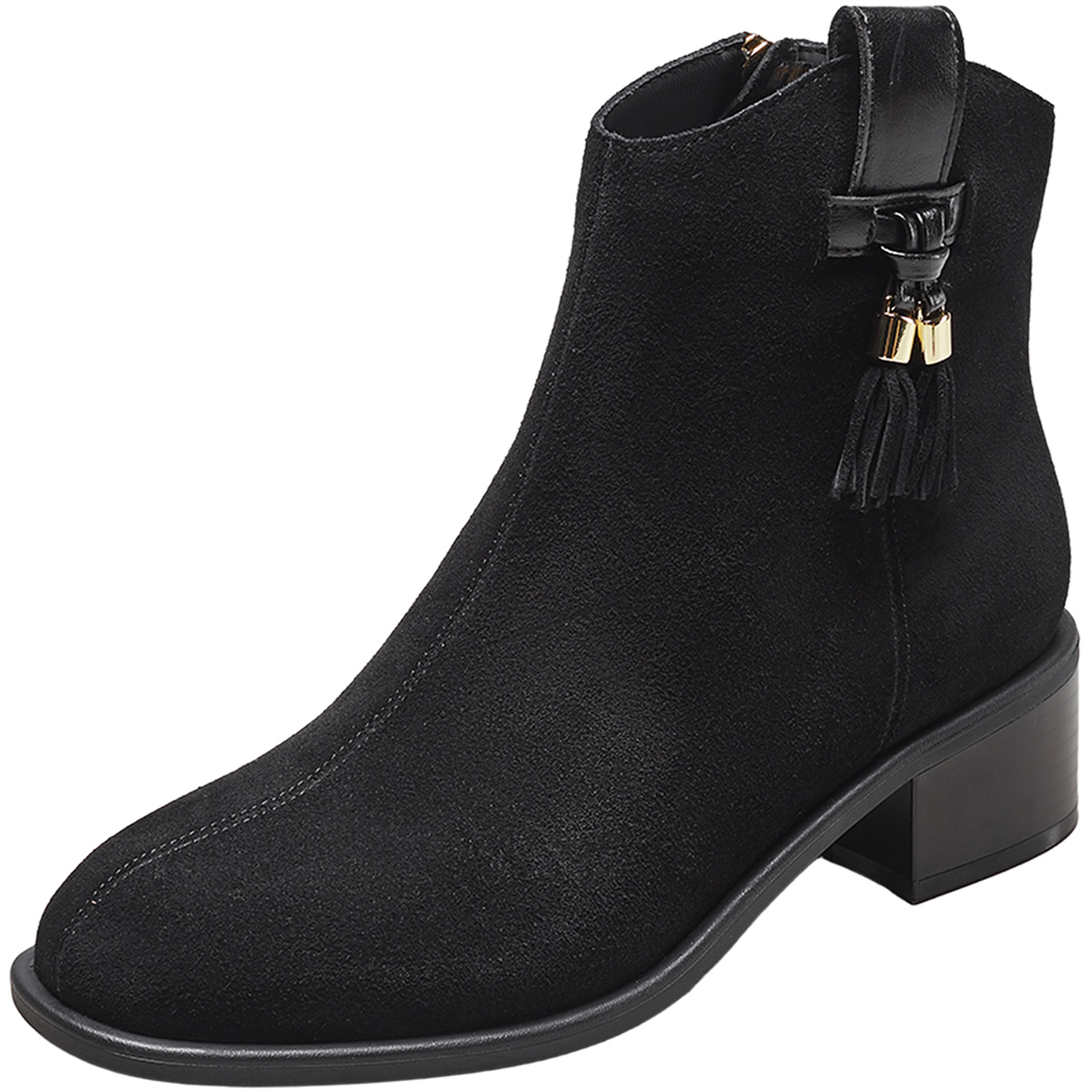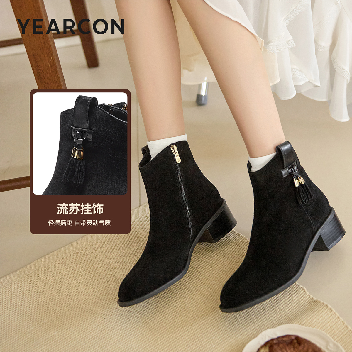 意尔康女鞋 休闲加绒短靴粗跟气质显瘦复古及踝靴女士磨砂 2025冬季
