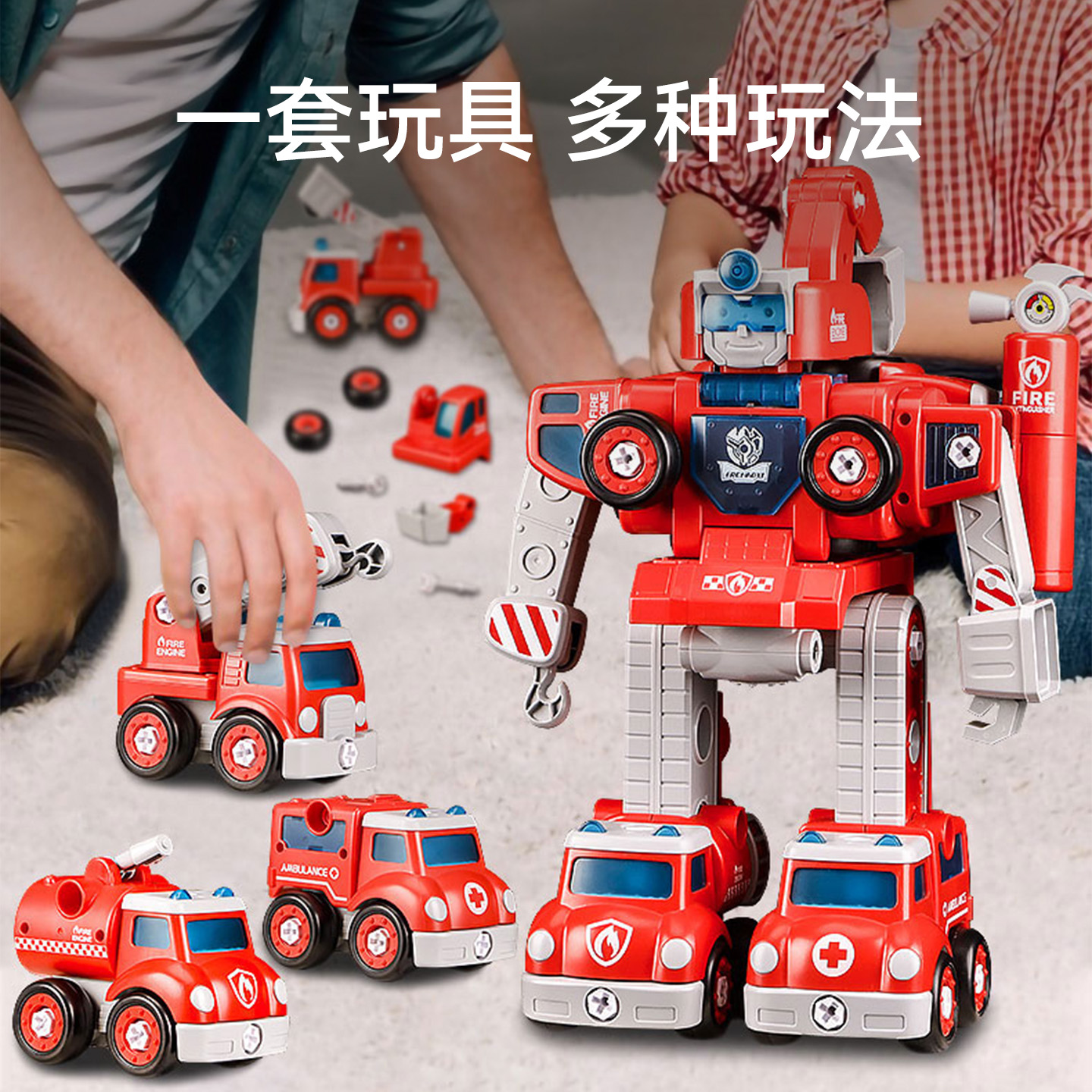 儿童变形玩具汽车男孩生日礼物组合拆装 五合体金刚消防机器人机甲