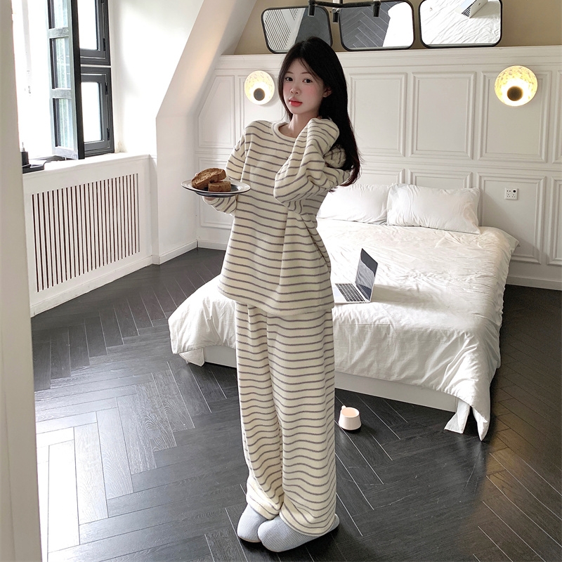 家居服套装 yso 半边绒卡通条纹长裤 睡衣女秋冬新款 酷猫系列