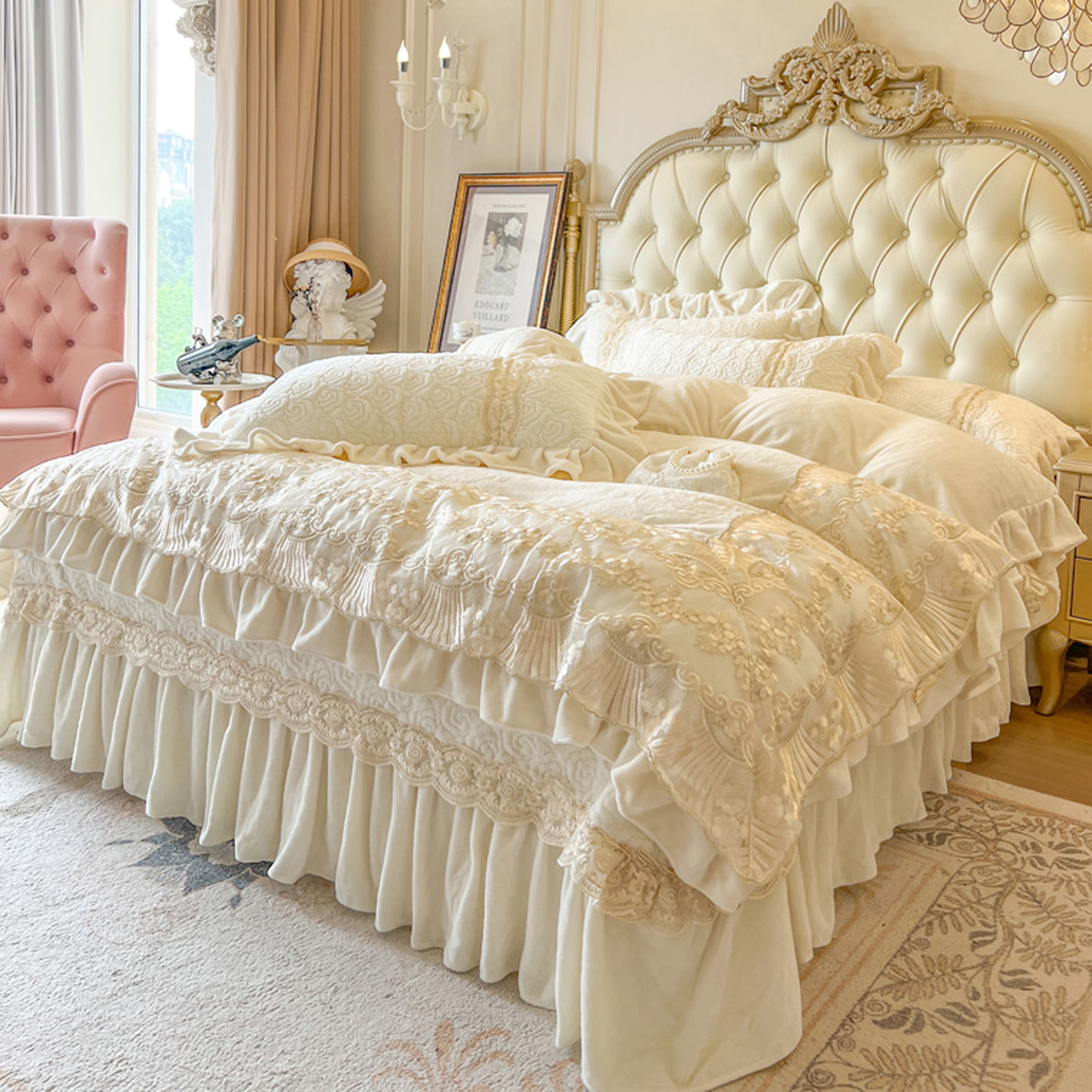 法式 高端花边被套双面保暖床品 全消光牛奶绒四件套夹棉加厚床盖款