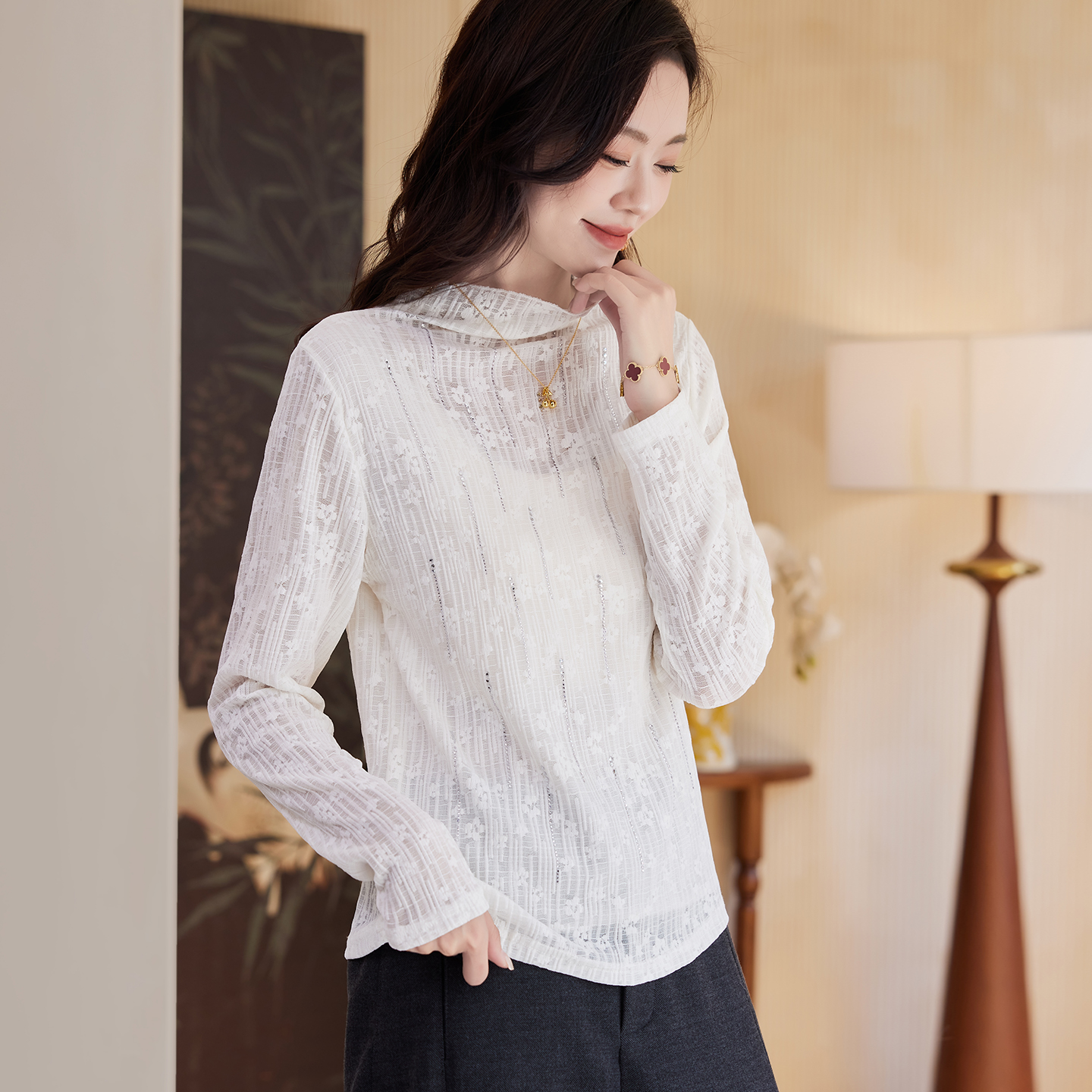 女修身 2025秋季 雪纺衫 长袖 显瘦百搭网纱蕾丝小立领打底上衣潮 时尚