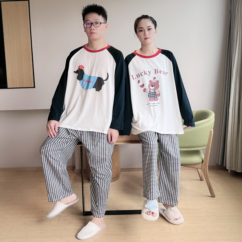 卡通可外穿家居服套装 2025新款 春秋季 猫人纯棉情侣睡衣一男一女款