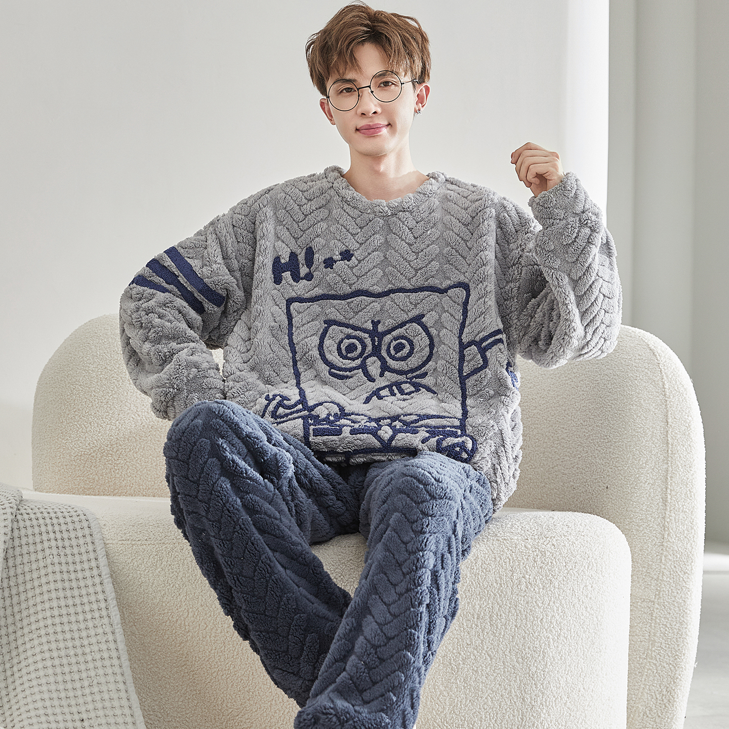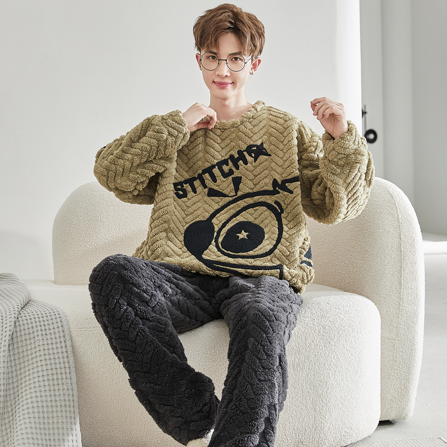 珊瑚绒加厚加绒圆领卡通青少年冬天家居服套装 睡衣男冬季 2025新款
