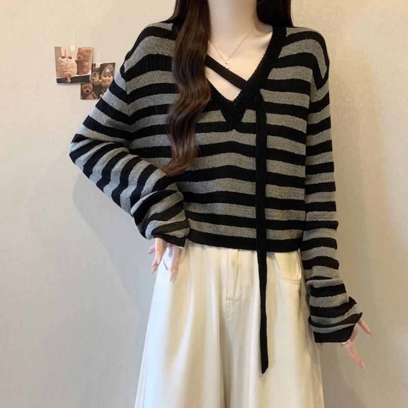 大码 胖mm显瘦短款 女装 针织衫 上衣1014c 遮肚子正肩V领系带长袖 冬季
