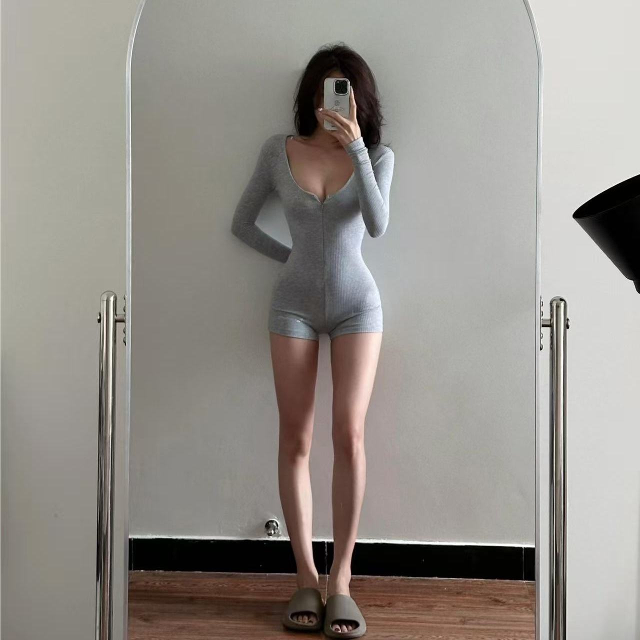 灰色紧身长袖 辣妹性感打底衫 连体衣连身短裤 新款 女士外穿秋季 美式
