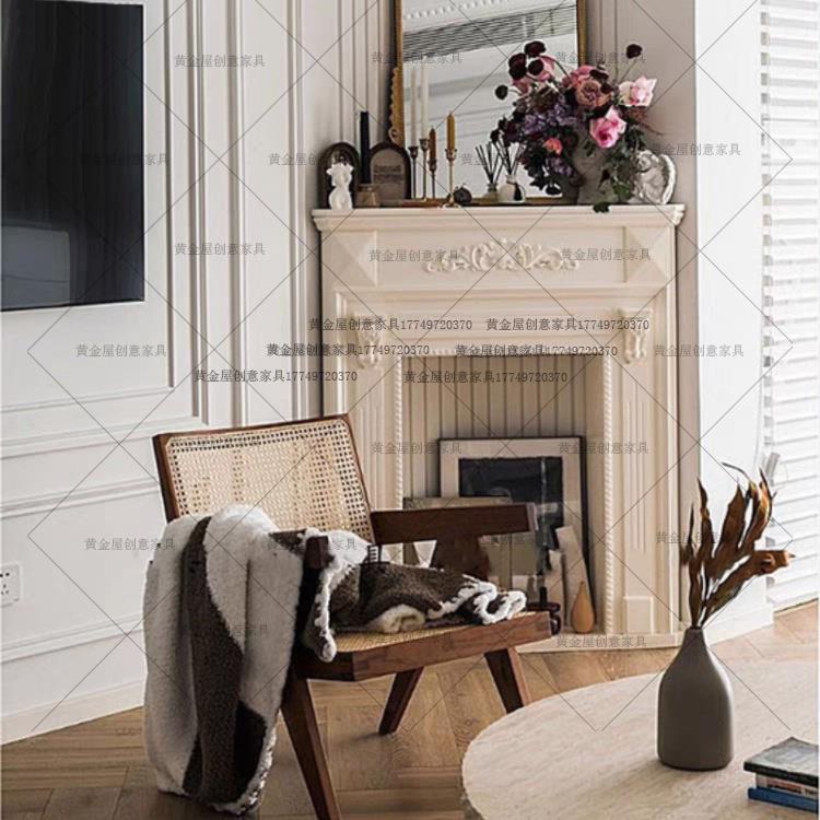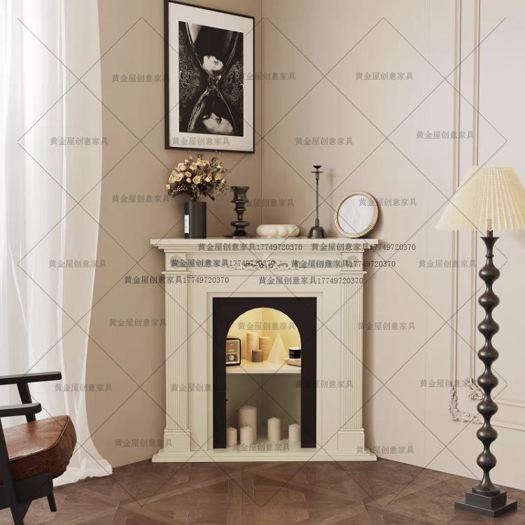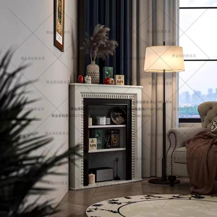 现代简约拐角玄关复古客厅置物架 饰柜美式 法式 转角实木雕花壁炉装