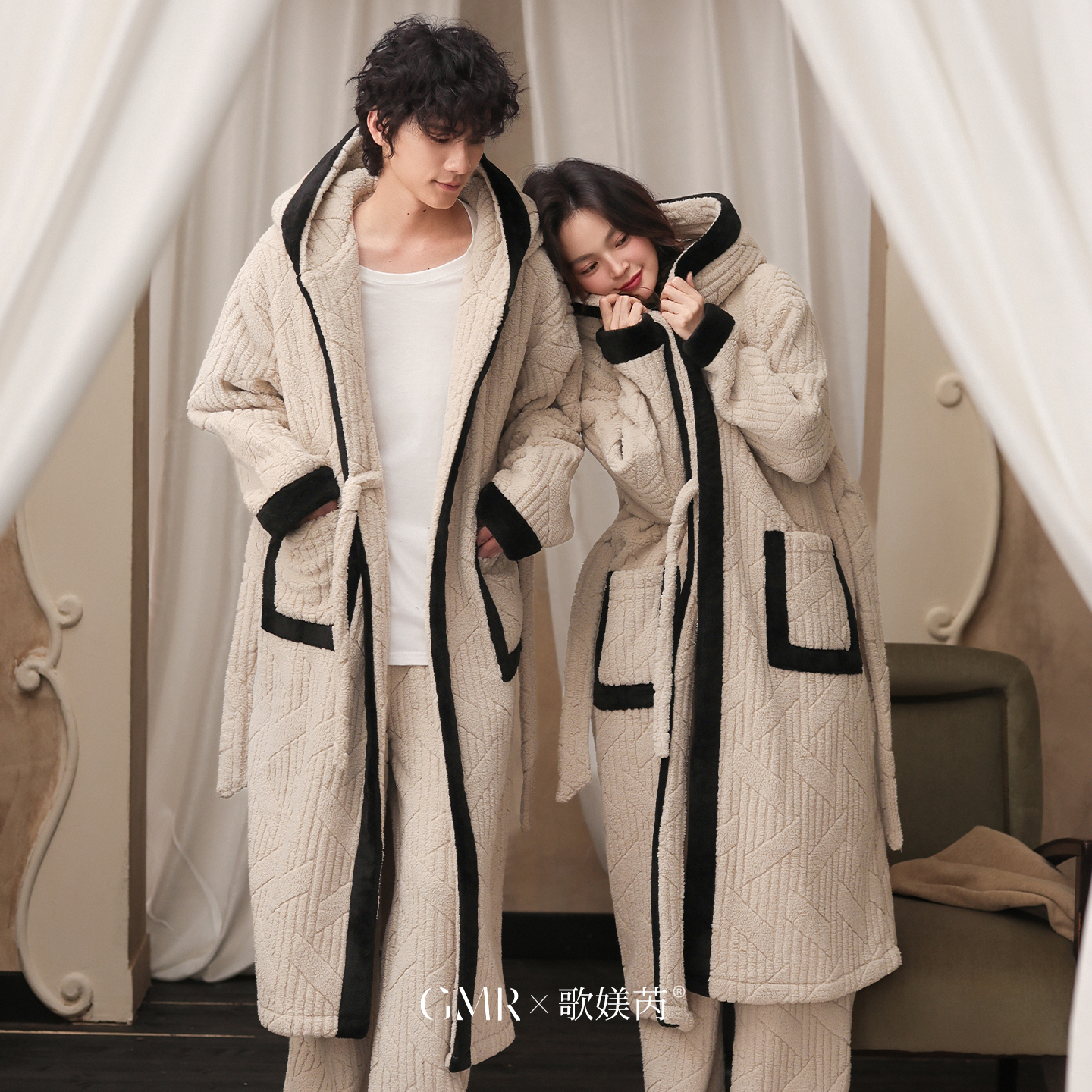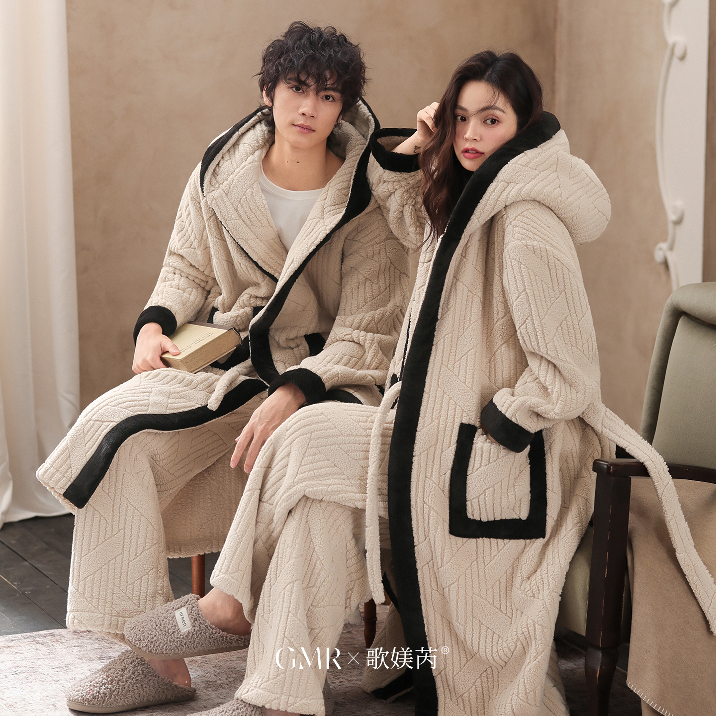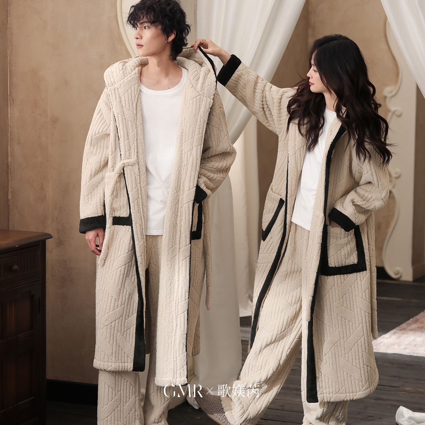 加厚法兰绒连帽家居服浴袍男士 情侣睡袍秋冬珊瑚绒长款 睡衣女冬季
