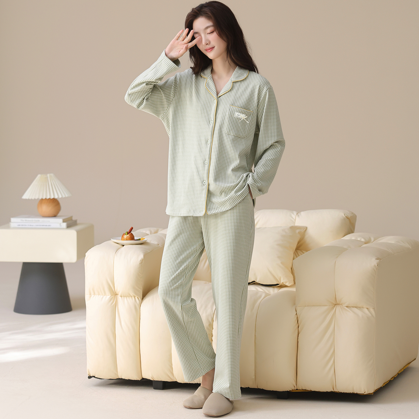 长裤 宜而爽格子印花女士德绒磨毛睡衣套装 长袖 宽松翻领开衫 秋冬款