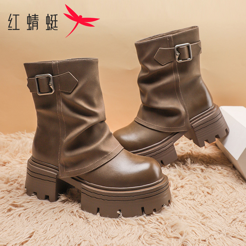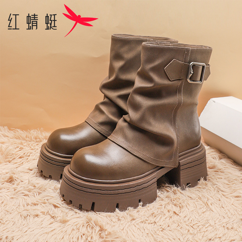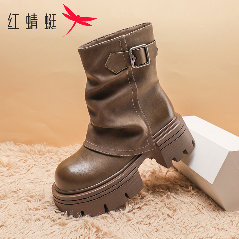 潮流圆头短靴厚底增高显瘦休闲堆堆机车靴 时尚 红蜻蜓女鞋 2025冬季