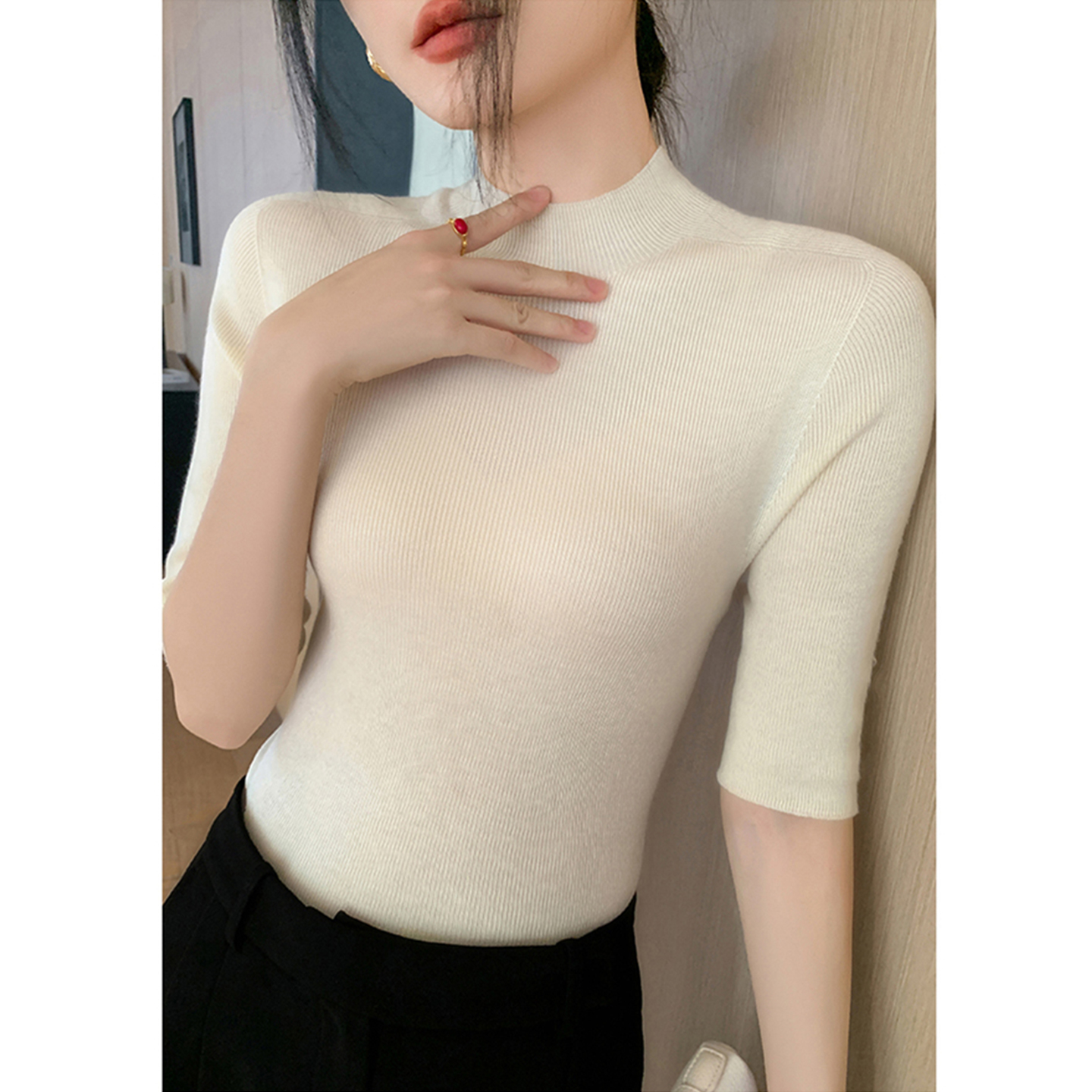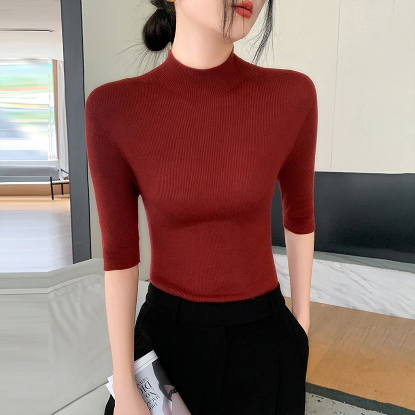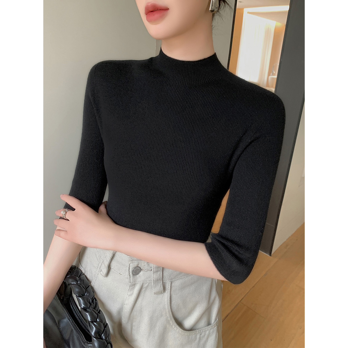 内搭上衣中袖 大码 毛衣女短袖 针织打底衫 t恤胖mm春秋 半高领五分袖