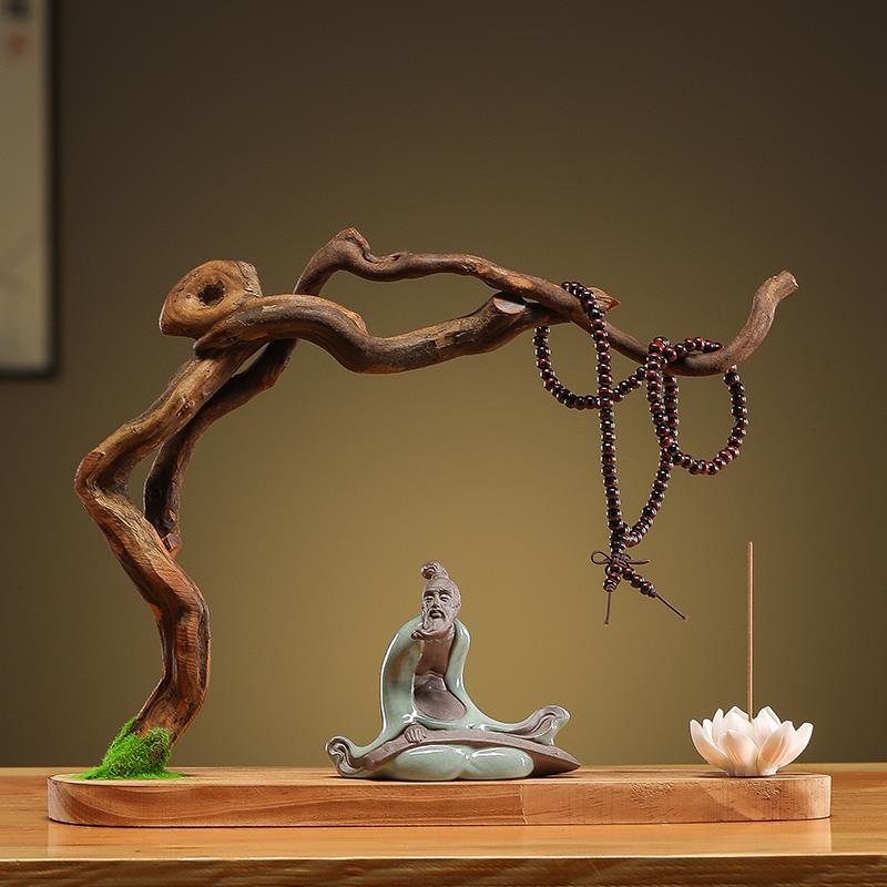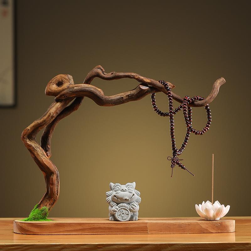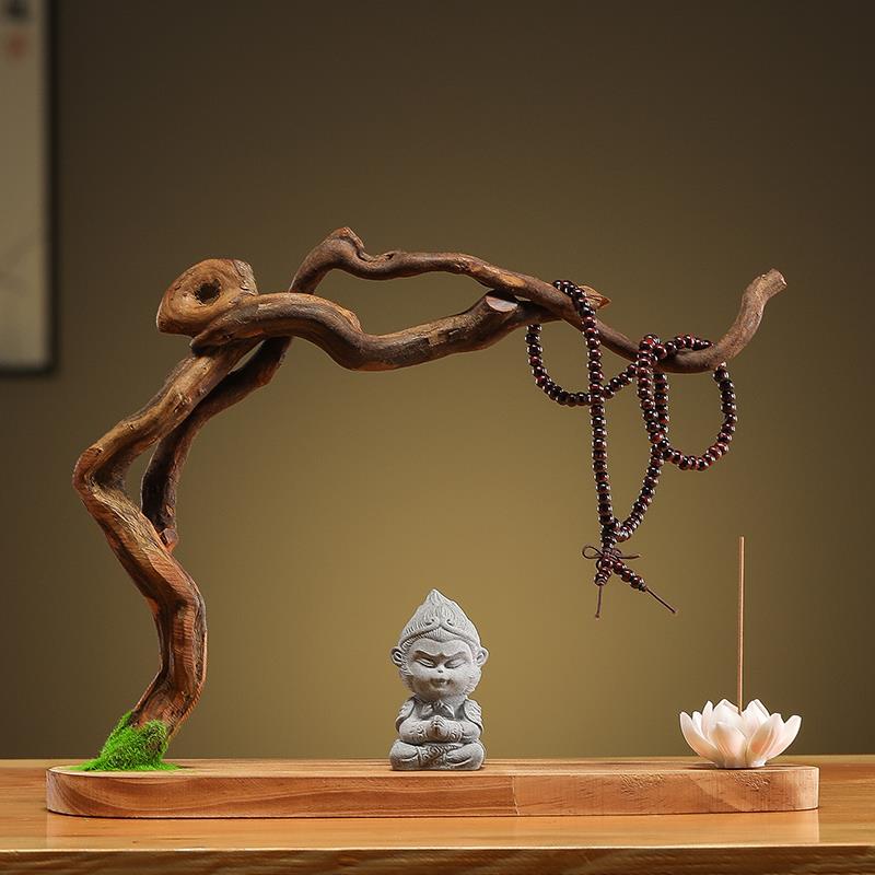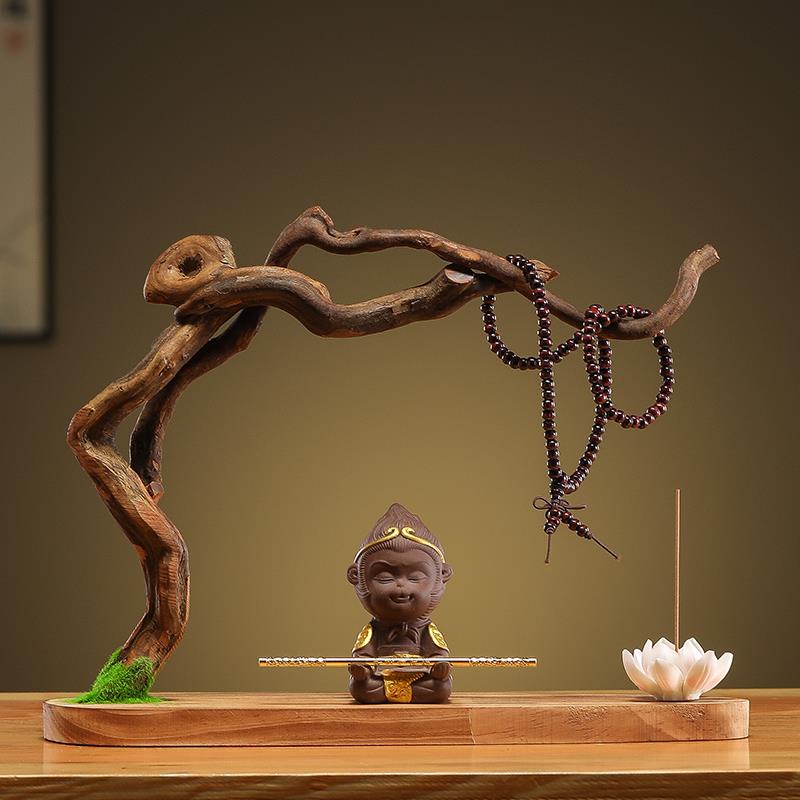 天然实木根雕摆件创意家居客厅装 饰工艺品风化木树根禅意悟空底座