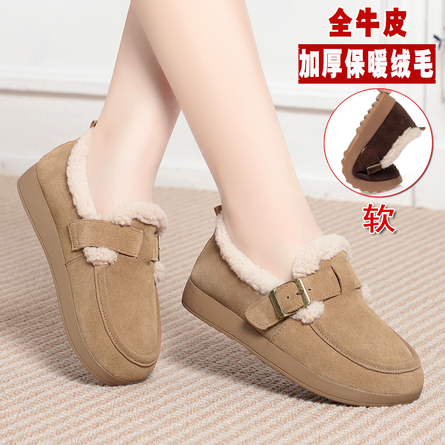 厚底冬季 包头半拖全包单鞋 女鞋 女士外穿棉鞋 毛毛鞋 真皮加绒勃肯鞋