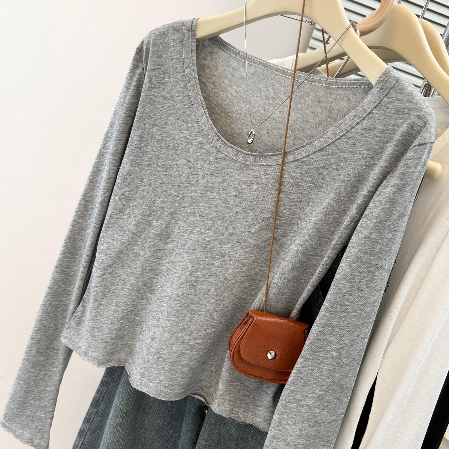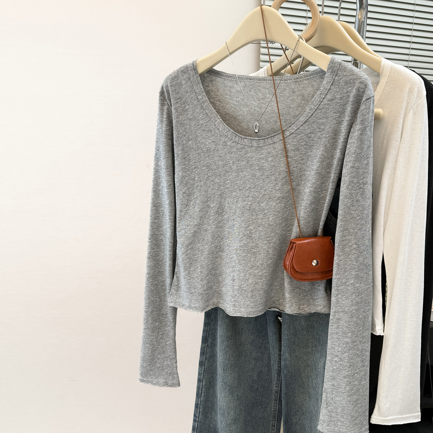 内搭小衫 chic甜辣大领口U领正肩长袖 短款 修身 上衣 T恤女早春秋韩版