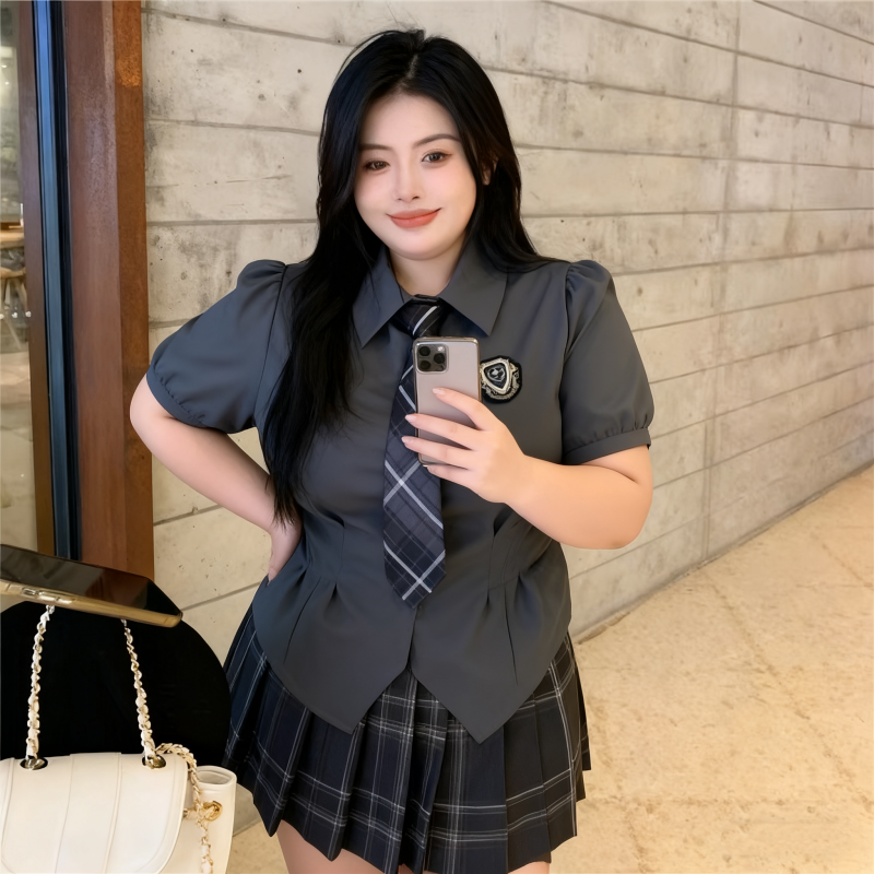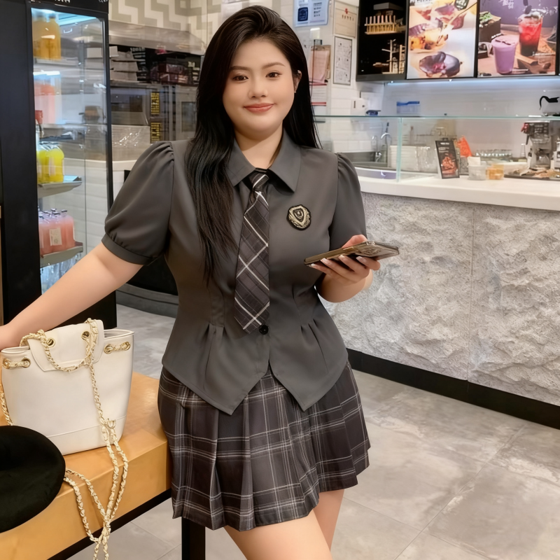 格纹百褶裙女辣妹显瘦jk制服套装 收腰衬衫 胖mm甜辣学院风短款 大码