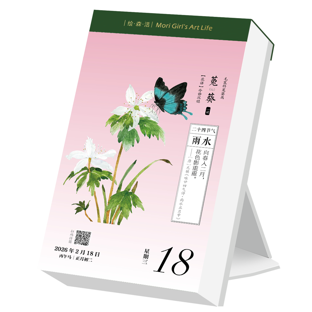花开有时日历2026年新款 赠贺卡丙午马年国风原创手绘水彩花卉插画诗词绿色可手撕翻页台历公司企业可定制办公桌面高颜值创意小摆台