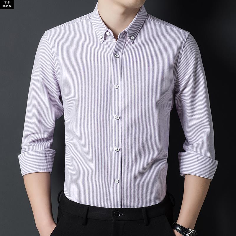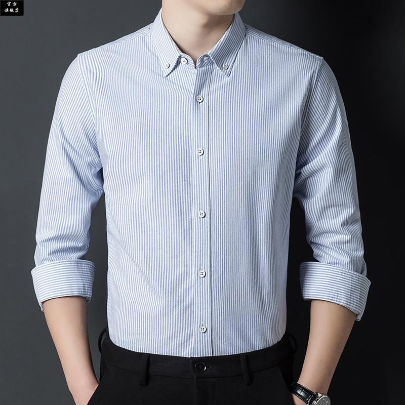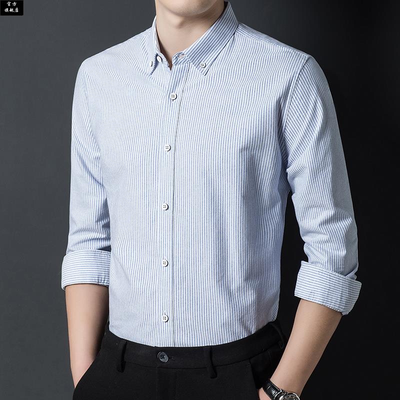 条纹休闲蓝色衬衣男士 新款 送老公 男长袖 100%纯棉红豆牛津纺衬衫