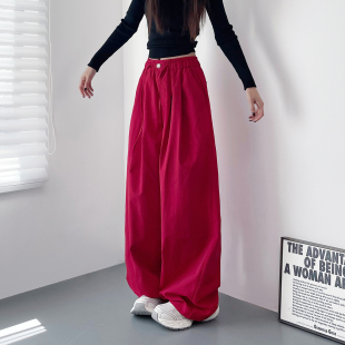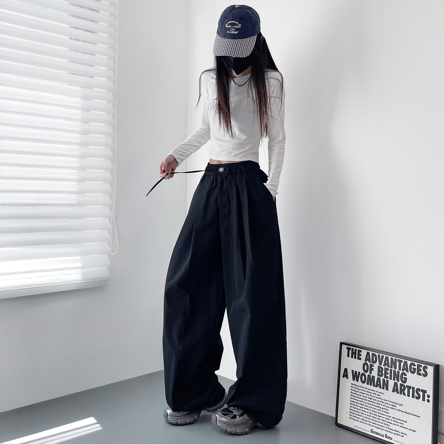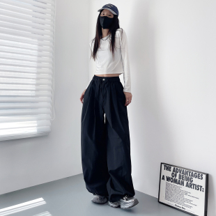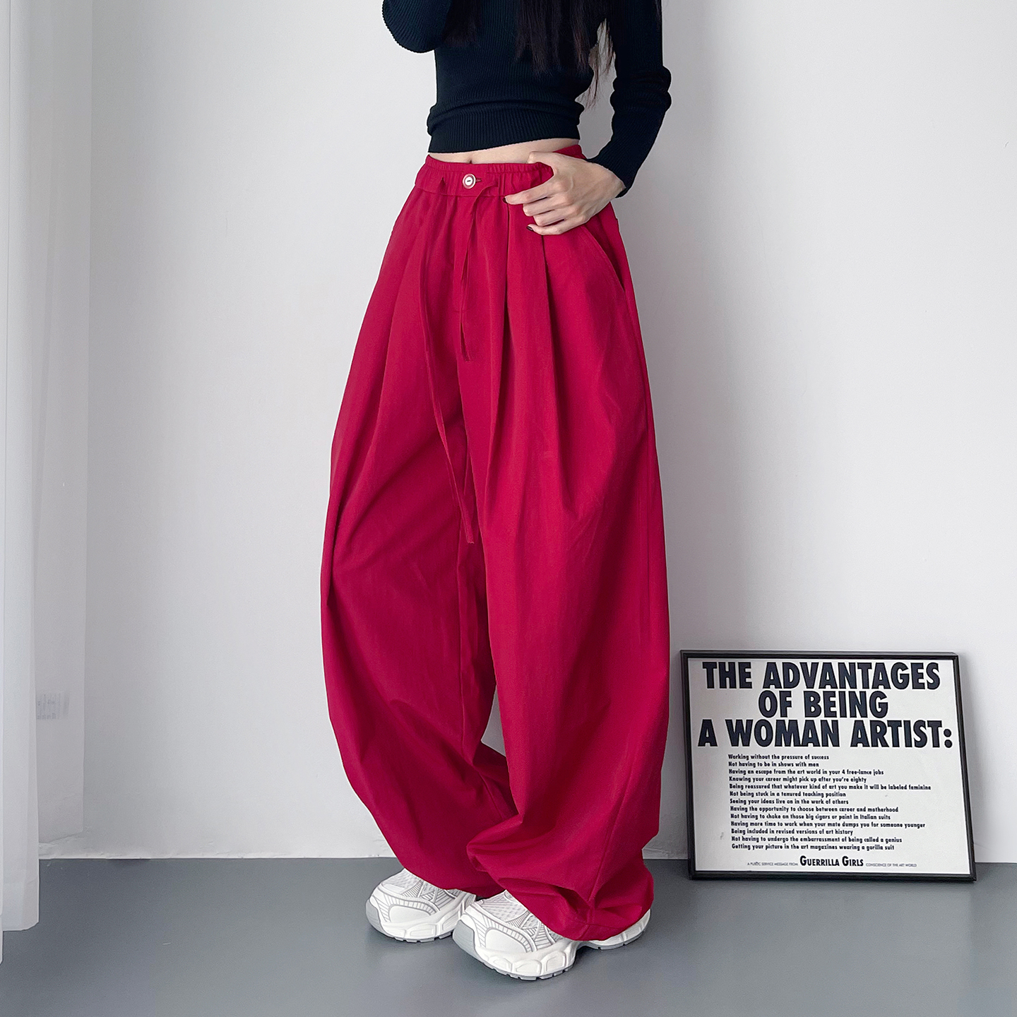 胖mm宽松显瘦慵懒运动休闲长裤 大码 女秋季 高腰抽绳压褶垂感阔腿裤