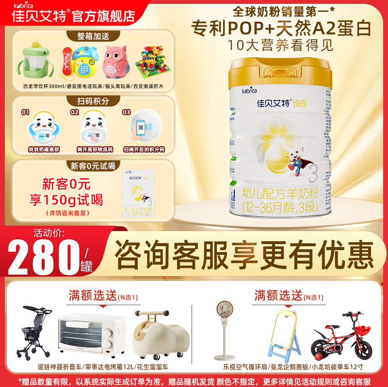旗舰店 3岁婴幼儿适用 佳贝艾特悦白幼儿配方羊奶粉3段800g