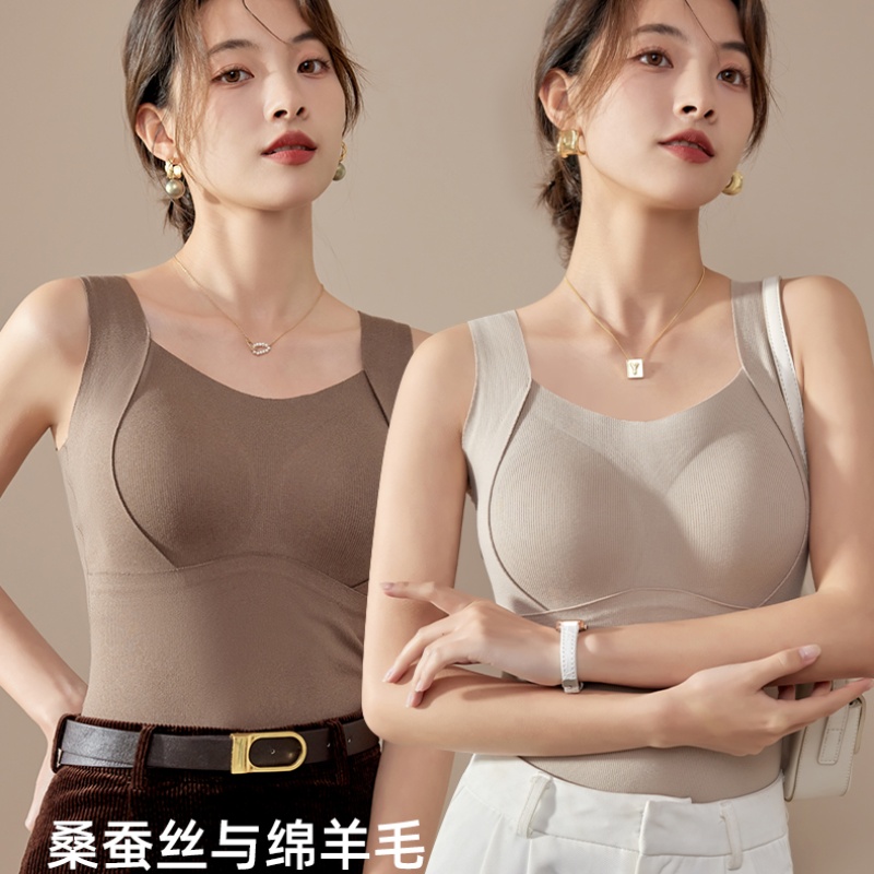 桑蚕丝保暖吊带背心女2025秋加绒加厚发热无痕自带胸垫一体内衣冬