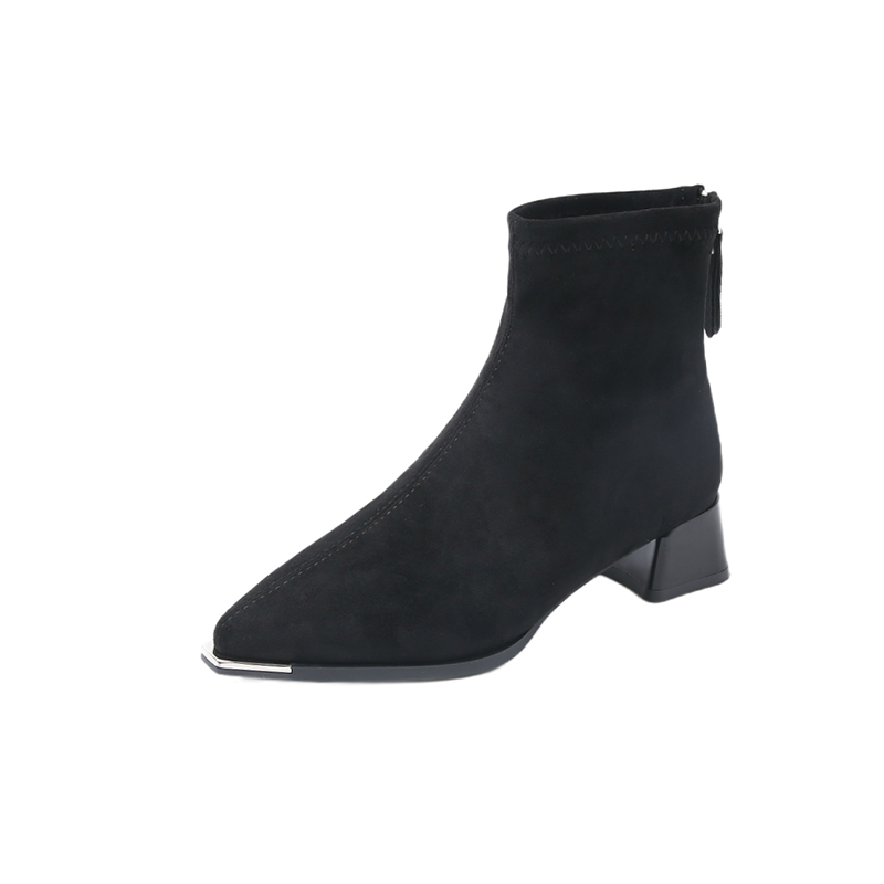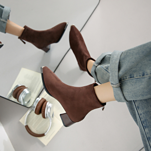 尖头弹力瘦瘦靴子 气质百搭绒面法式 粗跟小短靴女2025秋冬新款 时尚
