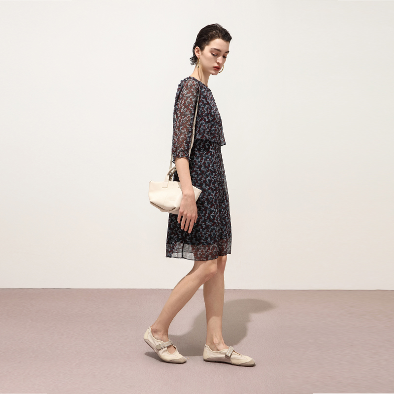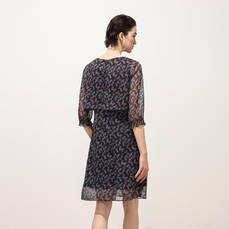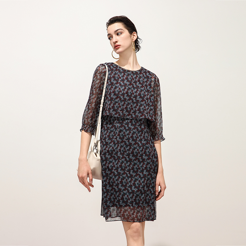 通勤碎花圆领连衣裙 宽松半透个性 Keywearcloud奇威秋季 气质五分袖