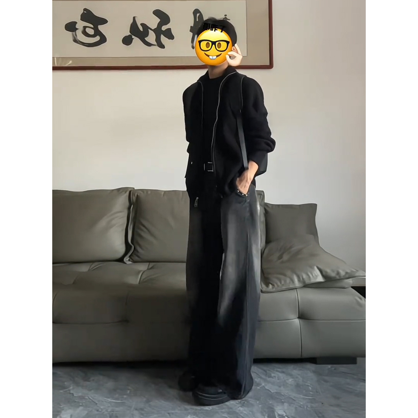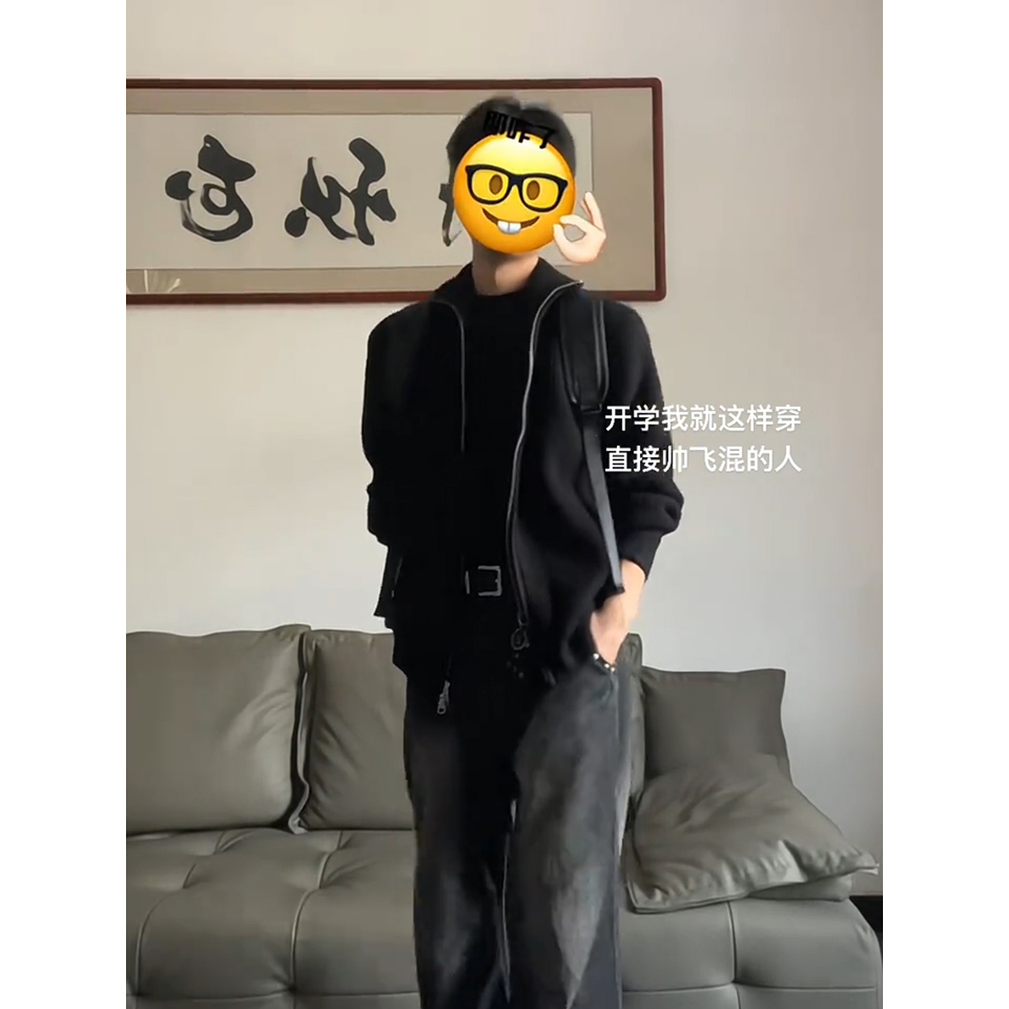 高级感痞帅慵懒风正肩外套 男士 cleanfit黑色立领针织开衫 毛衣套装
