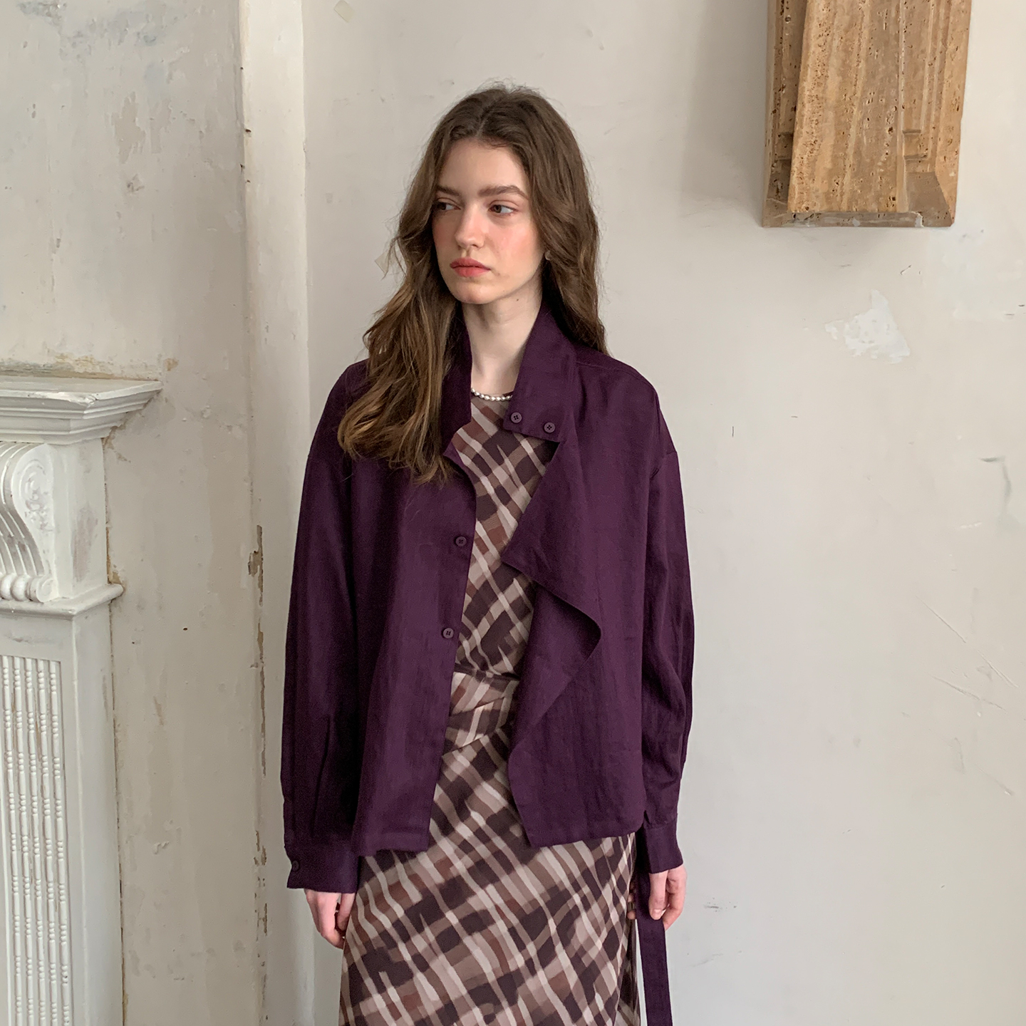 短款 复古紫红色亚麻修身 外套女秋系带气质感上衣 原创法式 竹依依