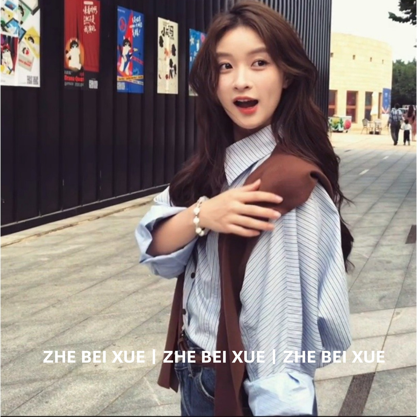 气质一整套ootd穿搭 百搭披肩高腰牛仔裤 套装 女松弛感蓝色条纹衬衫