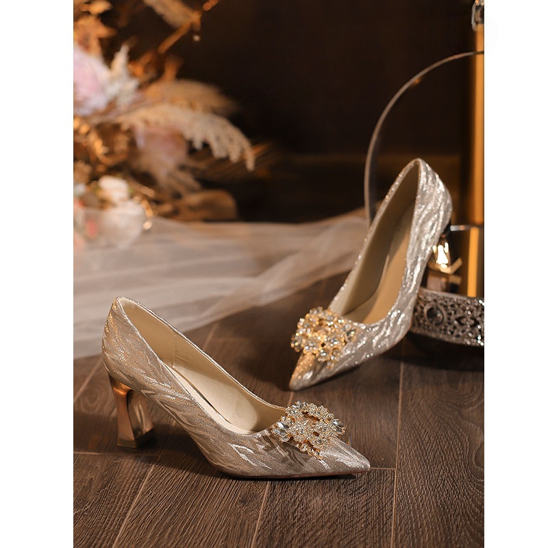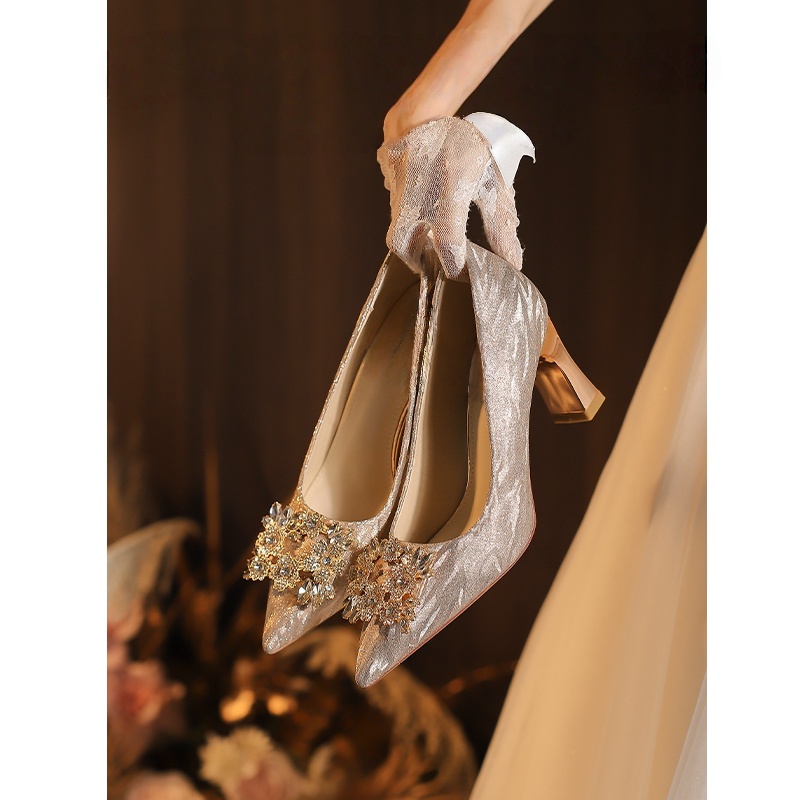 主纱秀禾两穿结婚新娘鞋 女不累脚高跟鞋 可穿尖头浅口 粗跟婚鞋 法式