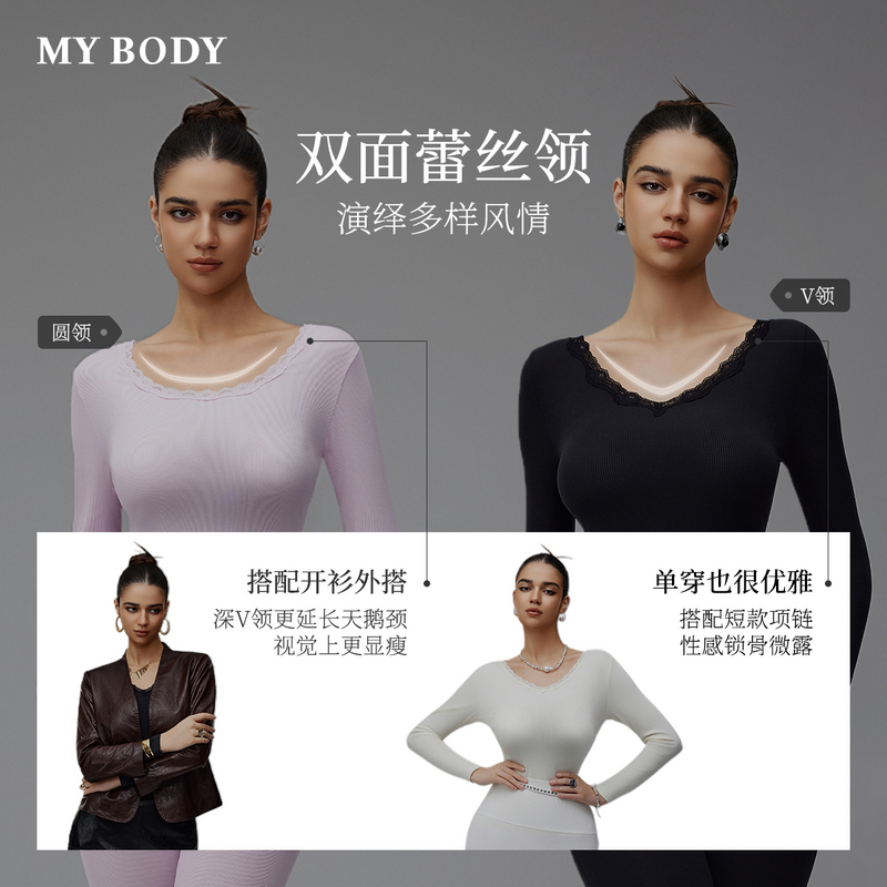 MYBODY时尚 非达人勿拍 蕾丝领外穿暖型衣保暖套装 好物体验