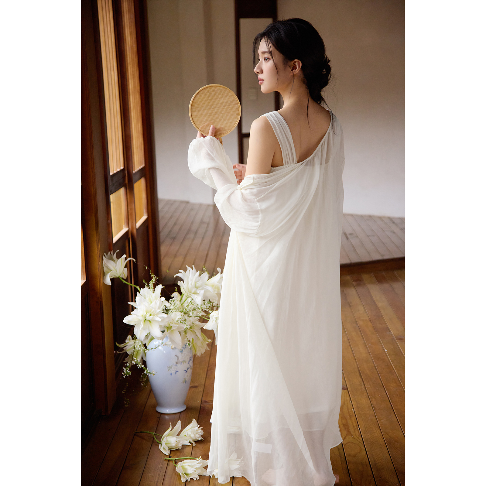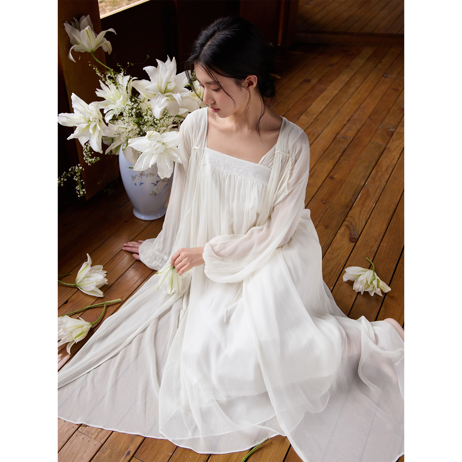 DPLAYSWEET法式 家居服 轻奢性感白色蕾丝缎面睡袍女士晨袍睡衣套装