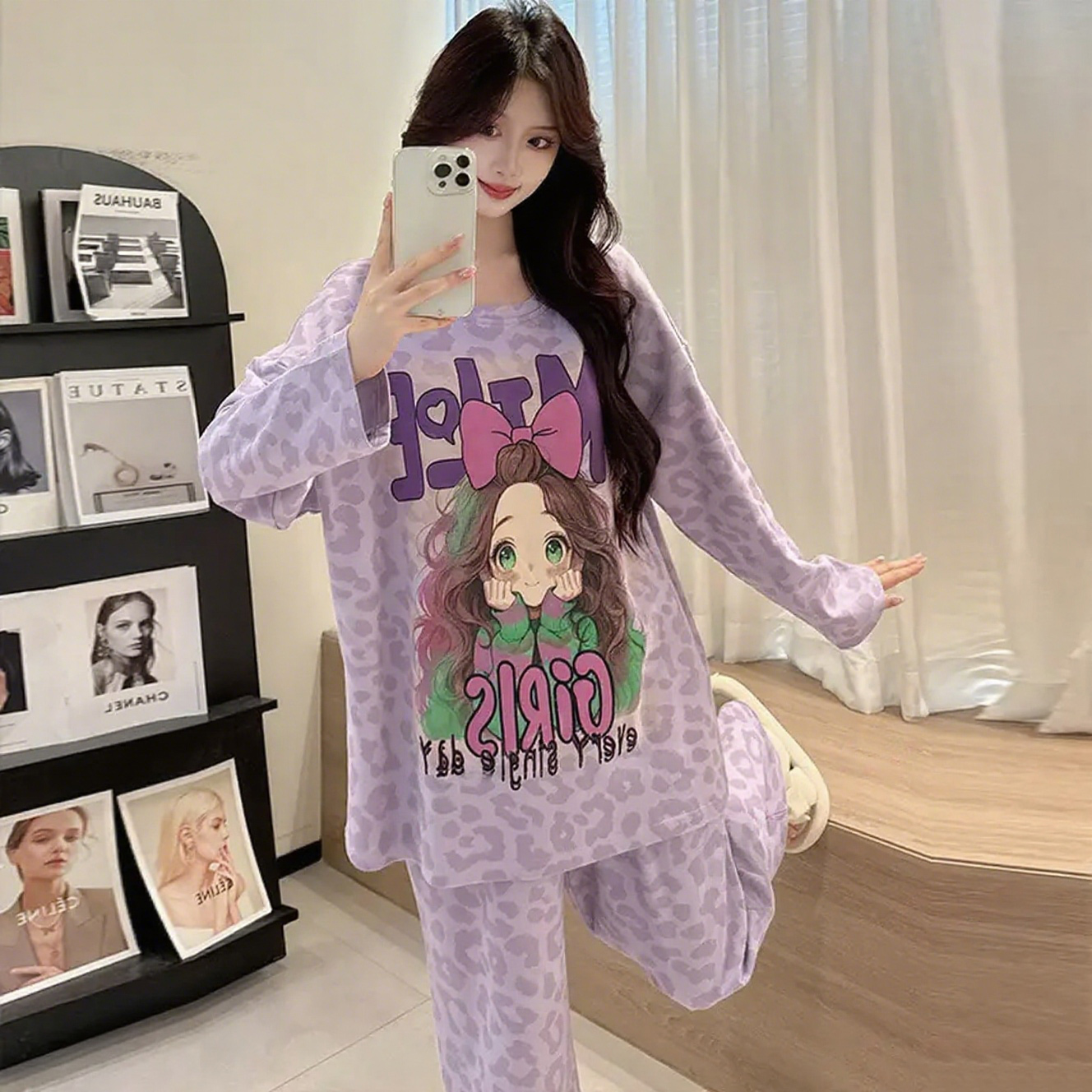 2025新款 可爱卡通休闲家居服套装 春秋季 长裤 纯棉长袖 猫人睡衣女款