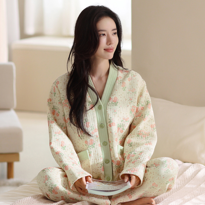 植物花卉外穿家居服2025年 夹棉薄款 芬腾空气棉睡衣女秋季 纯棉长袖