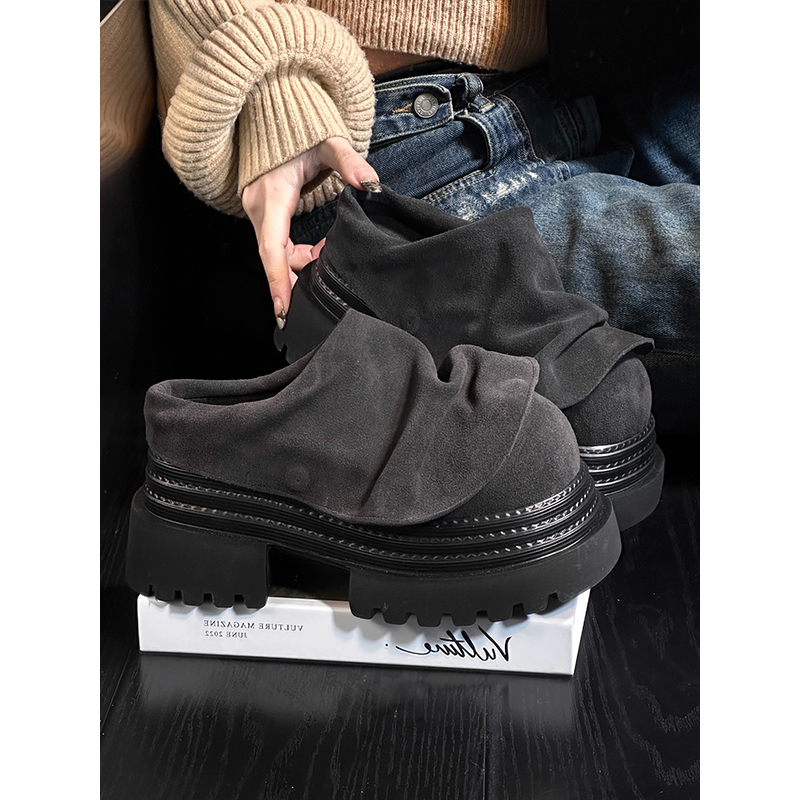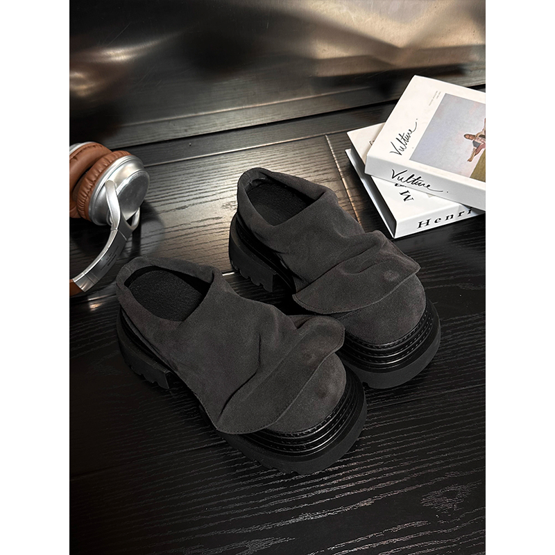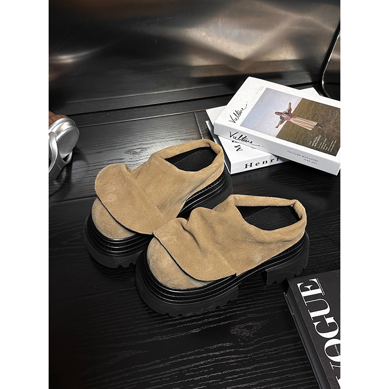 磨砂皮松糕厚底包头半拖鞋 女外穿复古真皮百搭小个子增高勃肯拖鞋