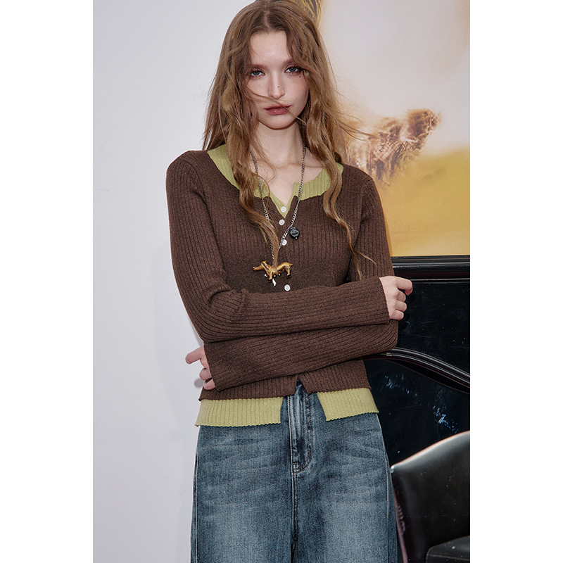 显瘦薄款 妖精 早秋穿搭修身 女2025新款 上衣 口袋假两件撞色针织衫