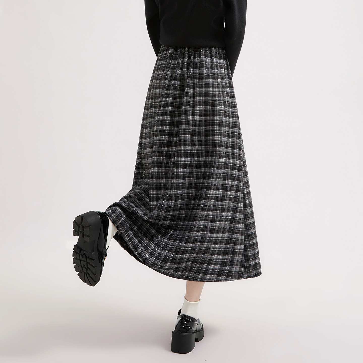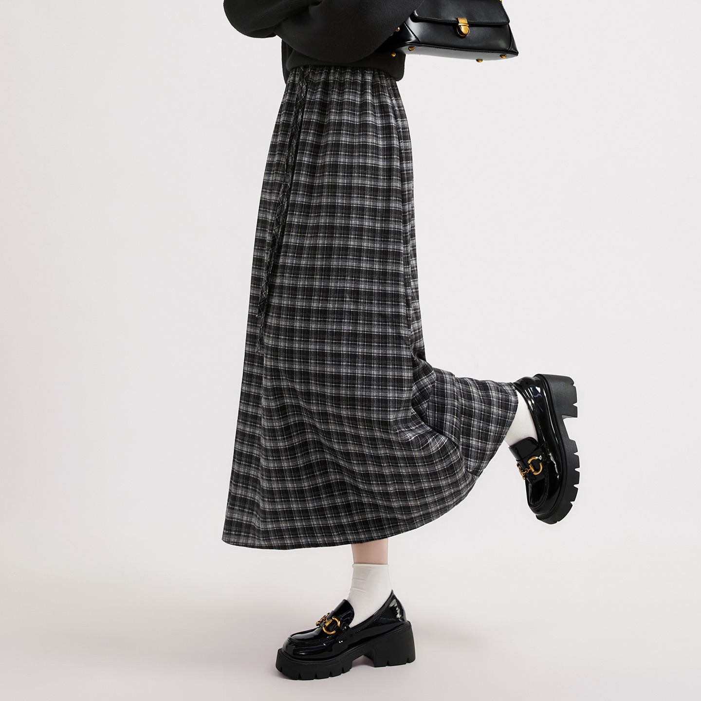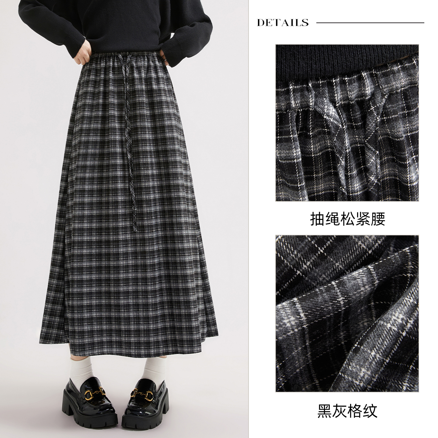 女装 新款 抽绳松紧腰复古格纹显瘦A字裙 半身裙2025秋装 她池长款