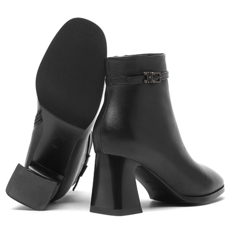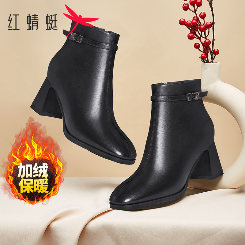 靴女百搭显瘦真皮粗跟短筒靴 加绒保暖高跟时装 红蜻蜓女鞋 2025冬季