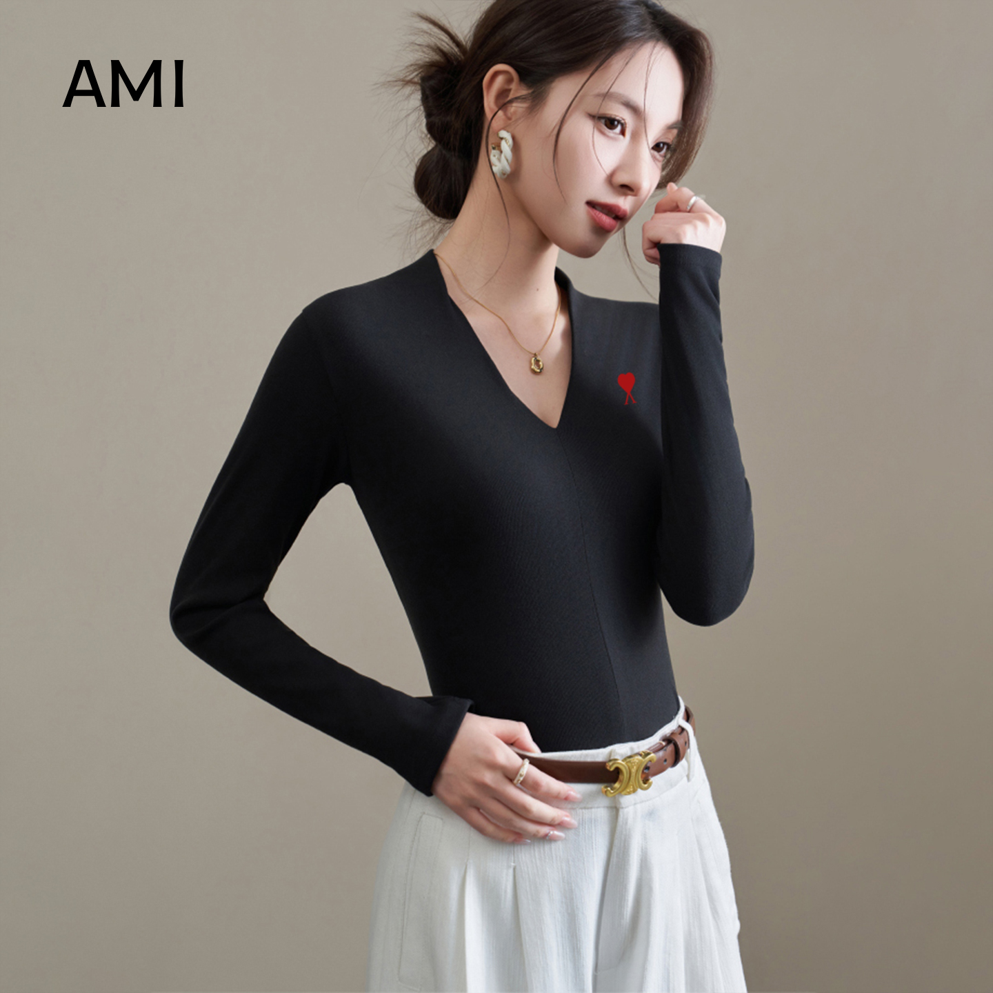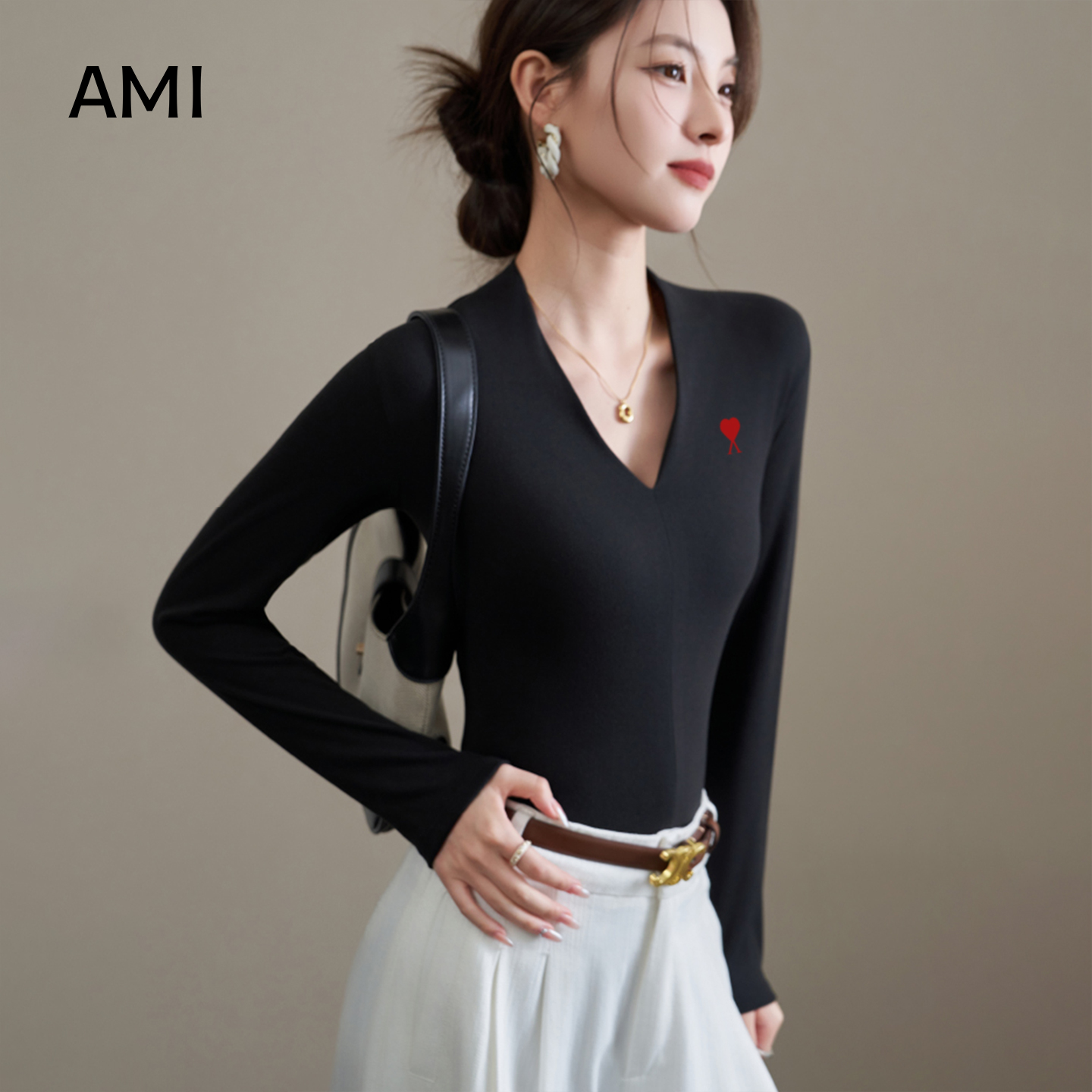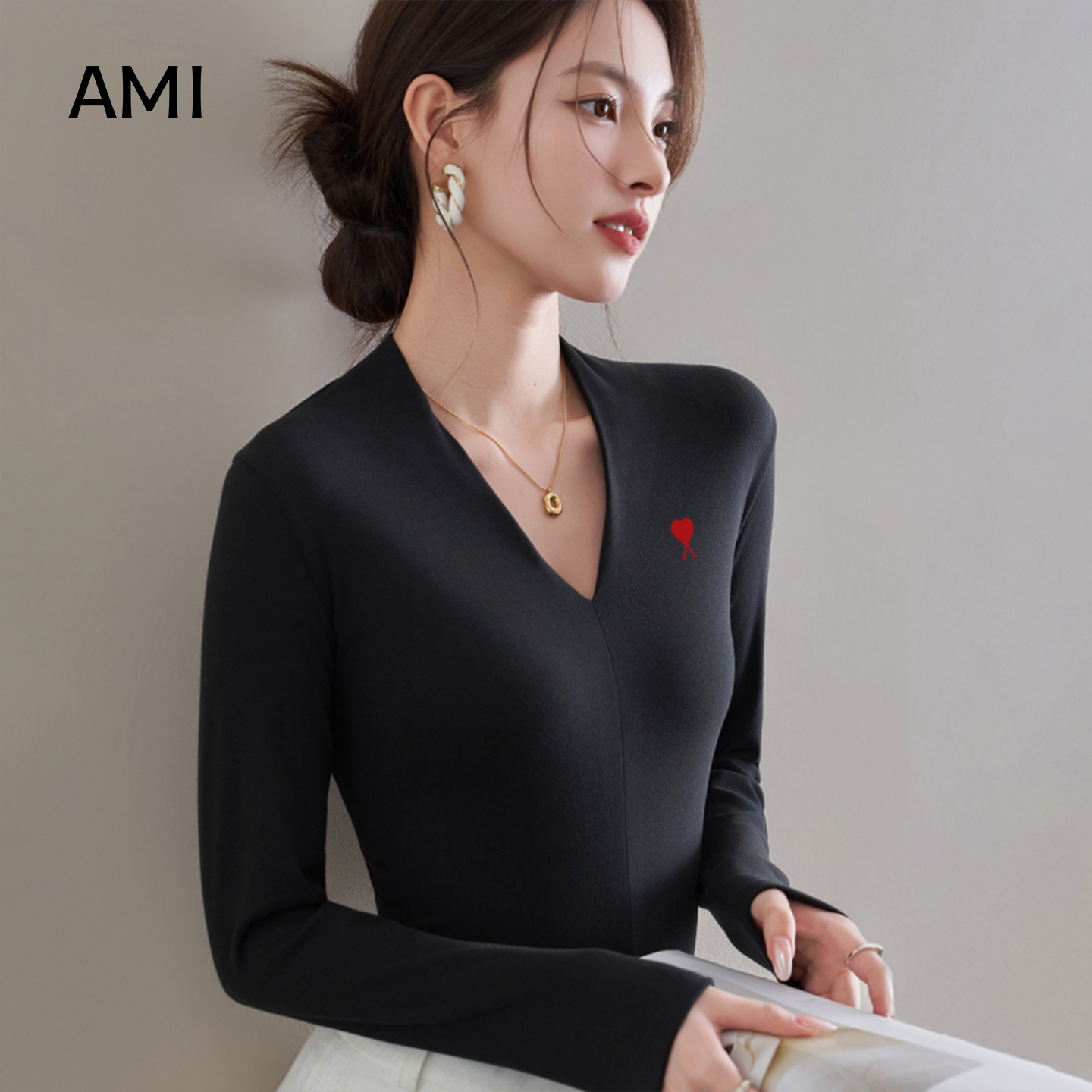 显瘦内搭打底衫 AMI美式 修身 T恤女春秋新款 辣妹上衣潮 复古V领长袖
