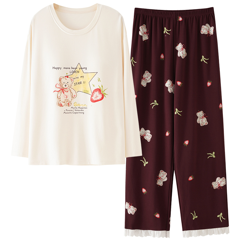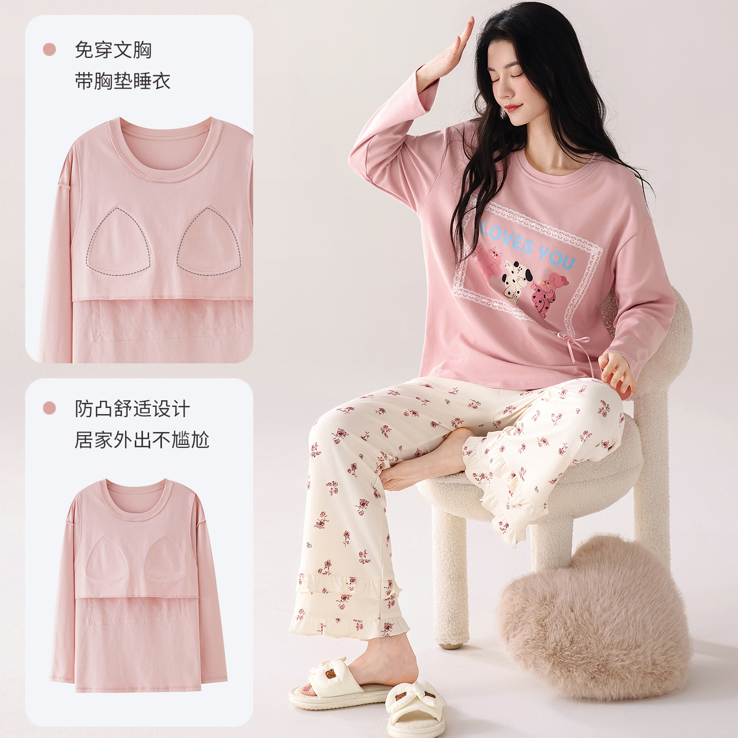 纯棉家居服套装 女士带胸垫秋冬天长袖 春秋季 婷美睡衣女2025新款