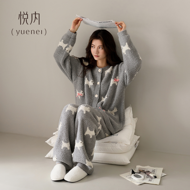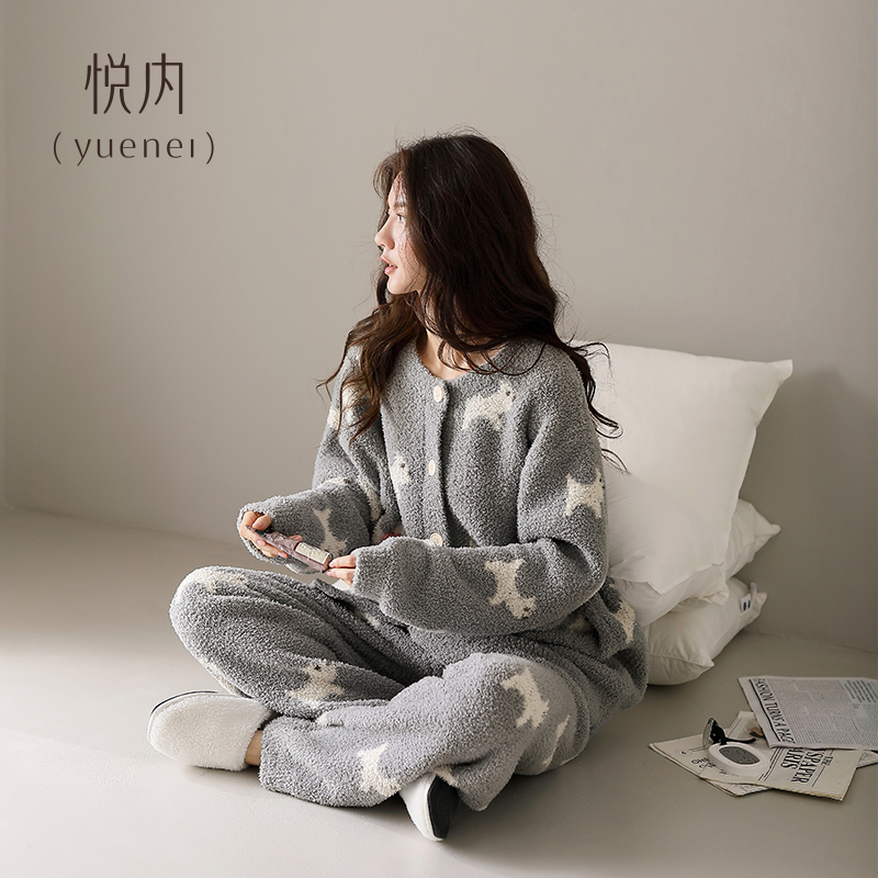 珊瑚绒保暖加厚加绒家居服圆领开衫 悦内半边绒睡衣女士秋冬季 冬款